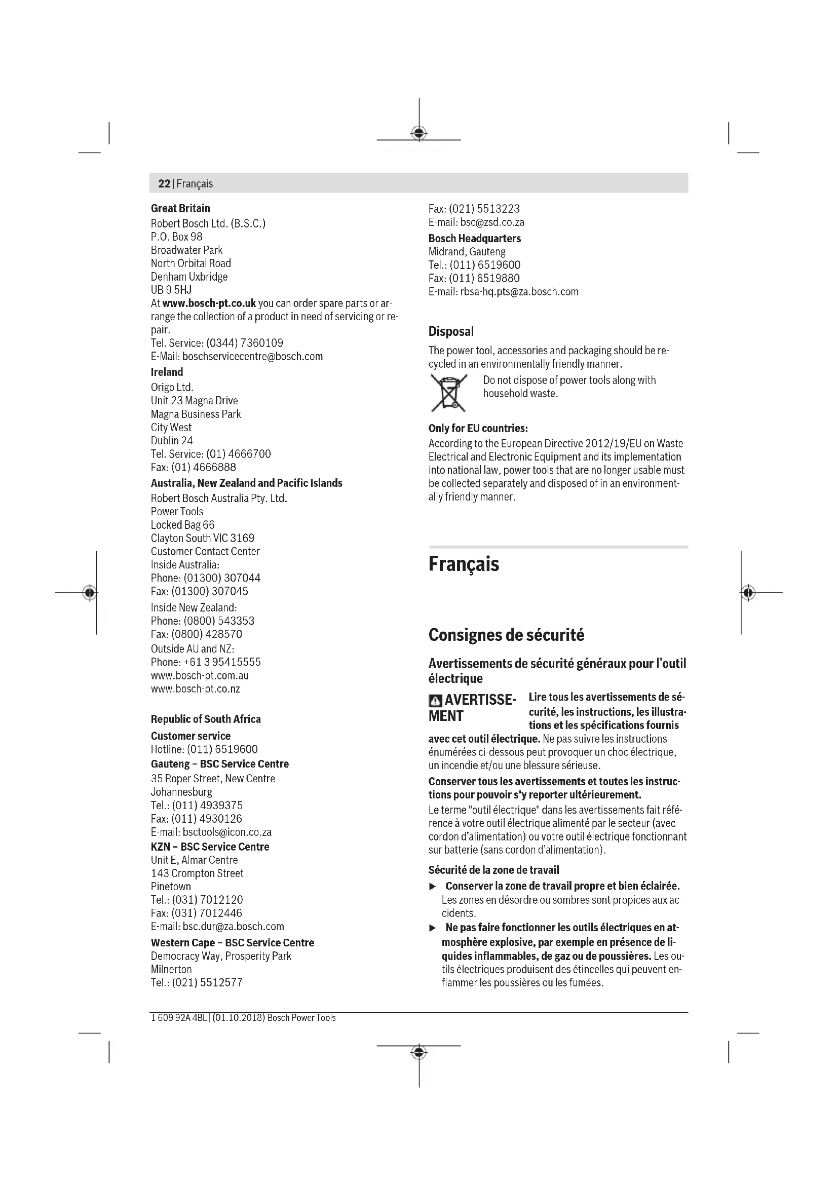 Attaching/changing the sanding sheet on the sanding plate The sanding plate(11) is fitted with a hook-and-loop fasten- ing, allowing sanding sheets with a hook-and-loop backing to be secured quickly and easily. Tap the hook-and-loop fastening of the sanding plate(11) before fitting the sanding sheet(12) to facilitate maximum adhesion. Position the sanding sheet(12) so that it is flush with one side of the sanding plate(11), then place the sanding sheet on the sanding plate and press it on firmly. To ensure optimum dust extraction, make sure that the punched holes in the sanding sheet are aligned with the drilled holes in the sanding plate. To remove the sanding sheet(12), take hold of it by a corner and pull it away from the sanding plate(11). You can use all sanding sheets, polishing and cleaning fleeces from the Delta 93mm series in Bosch’s range of ac- cessories. Sanding accessories such as fleece/polishing felt are at- tached to the sanding plate in the same way. Dust/chip extraction The dust from materials such as lead paint, some types of wood, minerals and metal can be harmful to human health. Touching or breathing in this dust can trigger allergic reac- tions and/or cause respiratory illnesses in the user or in people in the near vicinity. Certain dusts, such as oak or beech dust, are classified as carcinogenic, especially in conjunction with wood treatment additives (chromate, wood preservative). Materials contain- ing asbestos may only be machined by specialists. – Use a dust extraction system that is suitable for the ma- terial wherever possible. – Provide good ventilation at the workplace. – It is advisable to wear a P2 filter class breathing mask. The regulations on the material being machined that apply in the country of use must be observed. u Avoid dust accumulation at the workplace. Dust can easily ignite. Connecting the dust extraction system (see figure C) The dust extraction system (17) is only designed for use with the sanding plate (11); it serves no purpose when used together with other application tools. Always connect a dust extraction system for sanding. Remove the application tool and the depth stop (13) for fit- ting the dust extraction system (17) (accessory). Slide the dust extraction system (17) as far as it will go over the tool holder (6) onto the collar of the power tool. Turn the dust extraction system to the required position (not directly under the power tool). Push the clamping lever (15) shut to fix the dust extraction system in position. Plug the tool sleeve of the extraction hose (18) onto the ex- traction outlet (16). Connect the dust extraction hose (18) to a dust extractor (accessory). You will find an overview of how to connect various dust ex- tractors at the end of these operating instructions. The dust extractor must be suitable for the material being worked. When extracting dry dust that is especially detrimental to health or carcinogenic, use a special dust extractor. Operation Starting Operation u Pay attention to the mains voltage. The voltage of the power source must match the voltage specified on the rating plate of the power tool. u Products that are only sold in AUS and NZ: Use a resid- ual current device (RCD) with a nominal residual current of 30 mA or less. Switching On/Off u Make sure that you are able to press the On/Off switch without releasing the handle. To switch on the power tool, slide the on/off switch (1) for- ward so that "I" appears on the switch. The electronic soft start limits the torque when the power tool is switched on and increases the service life of the mo- tor. The Constant Electronic keeps the orbital stroke rate at no load and under load virtually consistent, guaranteeing uni- form performance.To switch off the power tool, slide the on/off switch (1) backwards so that "0" appears on the switch. Preselecting the orbital stroke rate You can even preselect the required orbital stroke rate dur- ing operation using the orbital stroke rate preselection thumbwheel (2). The required orbital stroke rate is dependent on the material and the work conditions and can be determined using prac- tical tests. Orbital stroke rate level “6” is recommended for sawing, cut- ting and sanding harder materials, such as wood or metal; orbital stroke rate level “4” is recommended for softer ma- terials, such as plastic. Practical Advice u Pull the plug out of the socket before carrying out any work on the power tool. u Always wait until the power tool has come to a com- plete stop before placing it down. Note: Do not keep the ventilation slots (3) on the power tool closed when working as this will reduce the service life of the power tool. Operating principle The oscillating drive causes the application tool to oscillate back and forth by 2.8° up to 20000 times per minute. This enables precise work in the tightest of spaces. Use a consistent, low contact pressure when performing work; otherwise, the performance will be impaired and the ap- plication tool may jam. While working, move the power tool back and forth to prevent the application tool overheating and jamming. Sawing u Use only undamaged saw blades that are in perfect condition. Bent or dull saw blades can break, negatively influence the cut, or lead to kickback. u When sawing lightweight materials, take into account the statutory provisions and recommendations of the material manufacturers. u Plunge cuts may only be applied to soft materials, such as wood, gypsum board, etc. Before using HCS saw blades to saw into wood, chipboard, building materials, etc., check these saw blades for foreign objects, such as nails, screws, etc. Remove the foreign ob- jects as required or use bi-metal saw blades. Cutting Note: When cutting wall tiles, please bear in mind that the application tools are subject to high wear if used for exten- ded periods. Sanding The material removal rate and sanding result are primarily determined by the choice of sanding sheet, the preselect