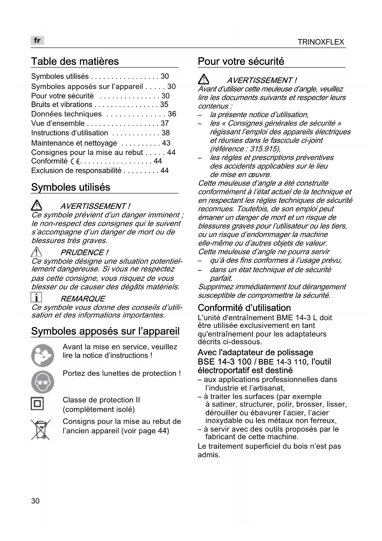 dans un état technique et de sécurité parfait. Supprimez immédiatement tout dérangement susceptible de compromettre la sécurité. Conformité d’utilisation L'unité d'entraînement BME 14-3 L doit être utilisée exclusivement en tant qu'entraînement pour les adaptateurs décrits ci-dessous. Avec l'adaptateur de polissage BSE 14-3 100 / BBE 14-3 110, l'outil électroportatif est destiné – aux applications professionnelles dans l’industrie et l’artisanat,– à traiter les surfaces (par exemple à satiner, structurer, polir, brosser, lisser, dérouiller ou ébavurer l’acier, l’acier inoxydable ou les métaux non ferreux,– à servir avec des outils proposés par le fabricant de cette machine.Le traitement superficiel du bois n’est pas admis.TRINOXFLEX