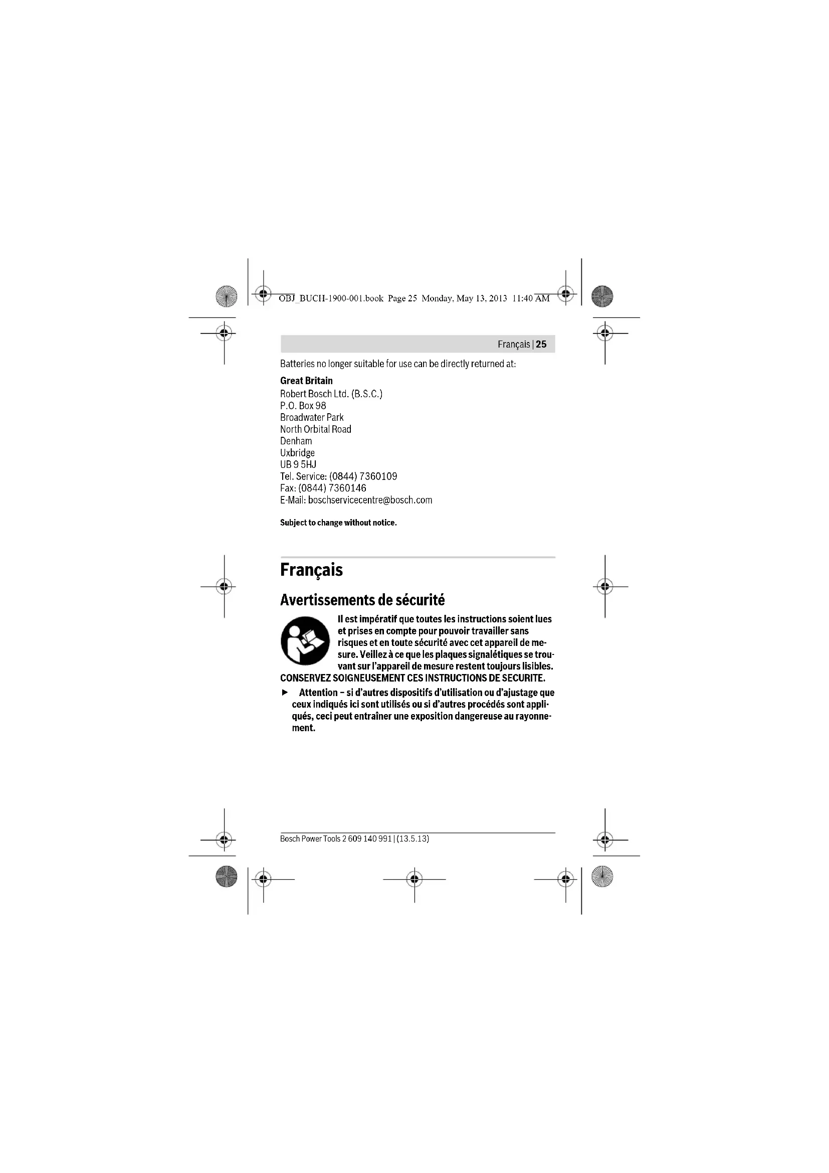 Type de laser 635 nm, <1 mW OBJ_BUCH-1900-001.book Page 27 Monday, May 13, 2013 11:40 AM28 | Français 2 609 140 991 | (13.5.13) Bosch Power Tools Montage Mise en place/changement des piles Pour le fonctionnement de l’appareil de mesure, nous recommandons d’utiliser des piles alcalines au manganèse. Pour ouvrir le couvercle du compartiment à piles 4, appuyez sur le dispo- sitif de verrouillage 5 dans le sens de la flèche et retirez le couvercle du compartiment à piles. Insérez les piles. Respectez ce faisant la polarité in- diquée sur la figure se trouvant à l’intérieur du compartiment à piles. Quand le symbole pile apparaît pour la première fois à l’écran, l’auto- nomie de mesure n’est plus que d’env. 15 minutes. Lorsque le symbole pile se met à clignoter, il faut remplacer les piles. Il n’est plus possible d’ef- fectuer des mesures. Diamètre du faisceau laser (à 25 °C) à une distance de 10 m env. 9mm Piles 2 piles 1,5 V LR03 (AAA) Durée de vie approximative des piles en mode de mesure