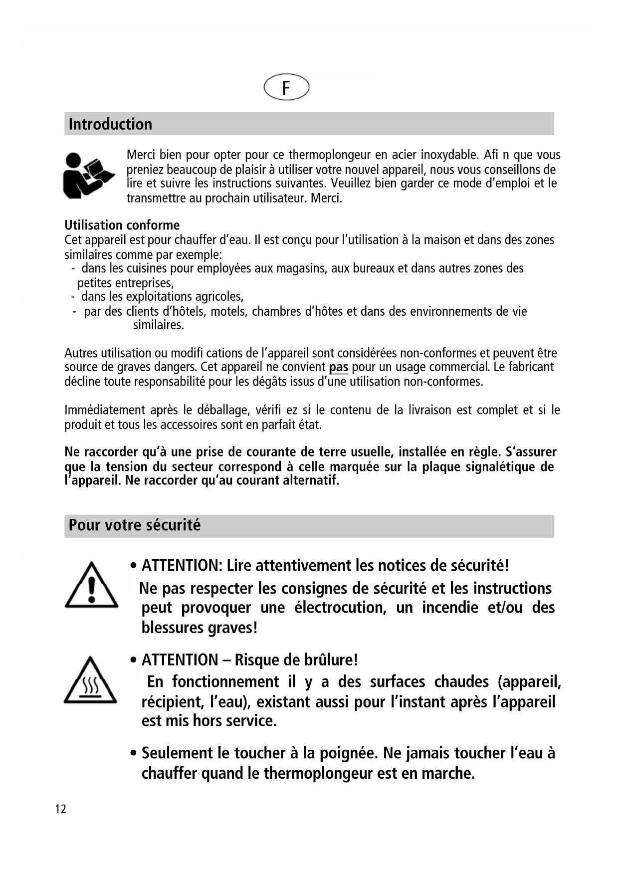 - Seulement le toucher à la poignée. Ne jamais toucher l’eau à chauffer quand le thermoplongeur est en marche.13 Consignes de sécurité générales: