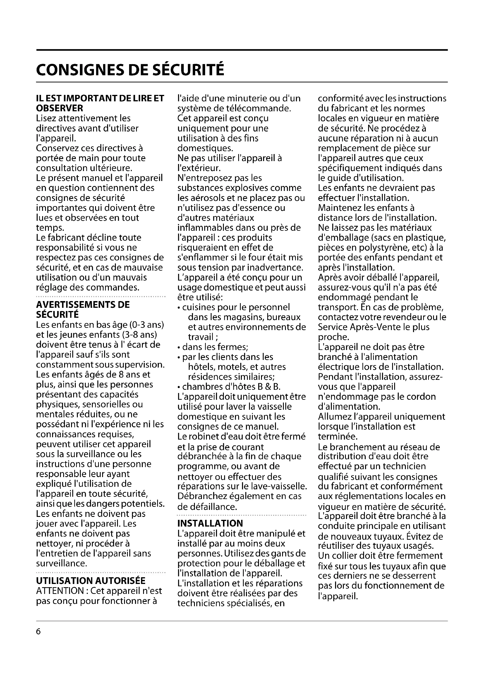 - chambres d'hôtes B & B. L'appareil doit uniquement être utilisé pour laver la vaisselle domestique en suivant les consignes de ce manuel. Le robinet d'eau doit être fermé et la prise de courant débranchée à la fin de chaque programme, ou avant de nettoyer ou effectuer des réparations sur le lave-vaisselle. Débranchez également en cas de défaillance. INSTALLATION L'appareil doit être manipulé et installé par au moins deux personnes. Utilisez des gants de protection pour le déballage et l'installation de l'appareil. L'installation et les réparations doivent être réalisées par des techniciens spécialisés, en conformité avec les instructions du fabricant et les normes locales en vigueur en matière de sécurité. Ne procédez à aucune réparation ni à aucun remplacement de pièce sur l'appareil autres que ceux spécifiquement indiqués dans le guide d'utilisation. Les enfants ne devraient pas effectuer l'installation. Maintenez les enfants à distance lors de l'installation. Ne laissez pas les matériaux d'emballage (sacs en plastique, pièces en polystyrène, etc) à la portée des enfants pendant et après l'installation. Après avoir déballé l'appareil, assurez-vous qu'il n'a pas été endommagé pendant le transport. En cas de problème, contactez votre revendeur ou le Service Après-Vente le plus proche. L'appareil ne doit pas être branché à l'alimentation électrique lors de l'installation. Pendant l'installation, assurez- vous que l'appareil n'endommage pas le cordon d'alimentation. Allumez l’appareil uniquement lorsque l’installation est terminée. Le branchement au réseau de distribution d'eau doit être effectué par un technicien qualifié suivant les consignes du fabricant et conformément aux réglementations locales en vigueur en matière de sécurité. L'appareil doit être branché à la conduite principale en utilisant de nouveaux tuyaux. Évitez de réutiliser des tuyaux usagés. Un collier doit être fermement fixé sur tous les tuyaux afin que ces derniers ne se desserrent pas lors du fonctionnement de l'appareil.7 Respectez les normes en vigueur de la société locale de distribution d'eau. Pression d'alimentation en eau : 0,05 - 1,0 MPa. La température d'entrée d'eau dépend du modèle du lave- vaisselle. Si le tuyau d'alimentation indique « max 25°C », la température maximum de l'eau ne doit pas dépasser 25°C. Pour tous les autres modèles, la température de l'eau permise est de 60°C. Ne coupez pas les flexibles et, en présence d'un appareil avec système de coupure de l'arrivée d'eau, ne plongez pas dans l'eau le boîtier en plastique de raccordement au réseau hydrique. Si les tuyaux sont trop courts, adressez-vous à votre revendeur. Assurez-vous que les tuyaux d'alimentation et de vidange ne sont ni pliés ni tordus. Avant toute utilisation, vérifiez l'étanchéité des tuyaux d' alimentation et de vidange de l'eau. Pendant l'utilisation, l'accès au mur arrière doit être limité, notamment en approchant le plus possible l'appareil du mur ou du meuble. Lors de l'installation de l'appareil, assurez-vous que les quatre supports sont stables et reposent sur le sol, en les ajustant au besoin, et assurez- vous que l'appareil est parfaitement de niveau en utilisant un niveau à bulle. Si l'appareil est installé à l'extrémité d'une rangée d'unités et que sa paroi latérale est exposée, protégez les charnières pour éviter qu'elle ne soit endommagée. Pour les lave-vaisselles avec des ouvertures à la base pour la ventilation, les ouvertures ne doivent pas être bloquées par un tapis. AVERTISSEMENTS ÉLECTRIQUES Pour que l'installation soit conforme à la réglementation en vigueur en matière de sécurité, un interrupteur omnipolaire avec un intervalle de contact minimum de 3 mm est requis, et la mise à la terre de l'appareil est obligatoire. Si le câble d'alimentation est endommagé, remplacez-le avec un câble identique. Le câble électrique ne doit être remplacé que par un technicien qualifié conformément aux directives du fabricant et aux normes de sécurité en vigueur. Adressez-vous à un Service Après-vente agréé. Si la fiche installée n'est pas adaptée pour votre prise, contactez un technicien qualifié. Une fois l'appareil installé dans son meuble, le câble d'alimentation doit être suffisamment long pour le brancher à l'alimentation électrique principale. Ne tirez pas sur le câble d'alimentation. N'utilisez pas de rallonge, de multiprise, ou d'adaptateurs. N'utilisez en aucun cas cet appareil si le cordon d'alimentation ou la prise de courant est endommagé, si l'appareil ne fonctionne pas correctement ou s'il a été endommagé ou est tombé. Éloignez le cordon des surfaces chaudes. Une fois l'installation terminée, l'utilisateur ne doit plus pouvoir accéder aux composantes électriques. Évitez de toucher l'appareil si vous êtes mouillé, et ne l'utilisez pas si vous êtes pieds nus. UTILISATION CORRECTE L'eau du lave-vaisselle n'est pas potable. Le nombre maximum de places est indiqué sur la fiche produit. La porte de devrait pas être laissée ouverte; vous pourriez trébucher dessus. La porte ouverte ne peut porter que le panier à vaisselle (chargé de vaisselle). N'appuyez pas d'objet sur la porte, ne vous asseyez pas et ne montez pas dessus. Utilisez uniquement des détergents et des produits de rinçage conçus pour un lave- vaisselle automatique.