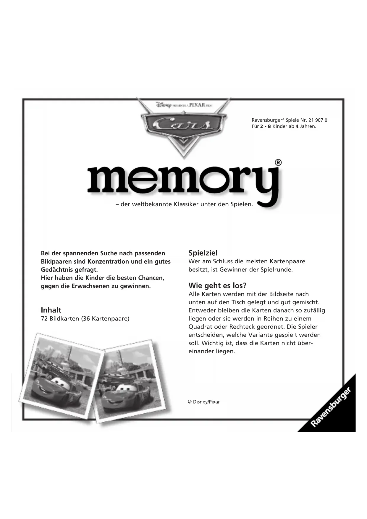 DisneyPixar Cars memory - Jeu de société RAVENSBURGER - Notice d'utilisation et mode d'emploi gratuit