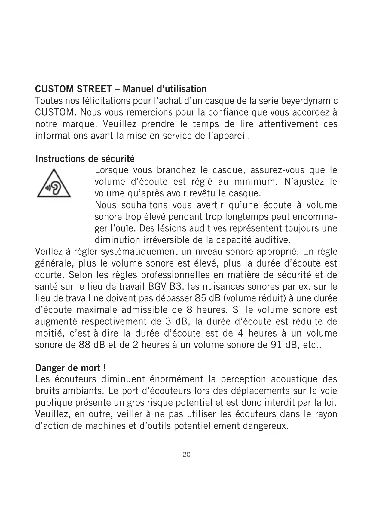 Custom Street - Ecouteur BEYERDYNAMIC - Notice d'utilisation et mode d'emploi gratuit