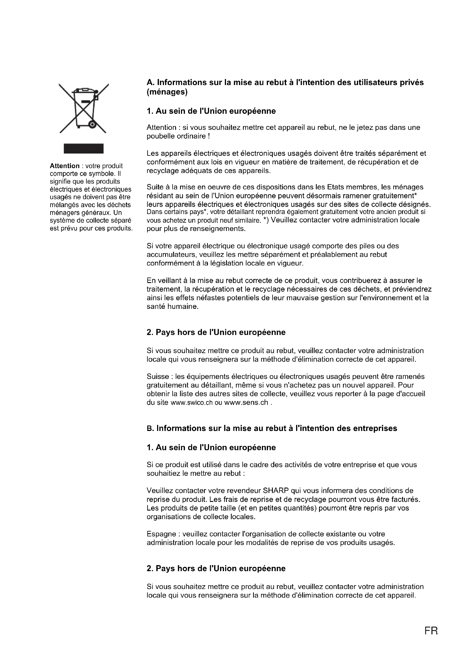 Si ce produit est utilisé dans le cadre des activités de votre entreprise et que vous souhaitiez le mettre au rebut : Veuillez contacter votre revendeur SHARP qui vous informera des conditions de reprise du produit. Les frais de reprise et de recyclage pourront vous être facturés. Les produits de petite taille (et en petites quantités) pourront être repris par vos organisations de collecte locales. Espagne : veuillez contacter l'organisation de collecte existante ou votre administration locale pour les modalités de reprise de vos produits usagés.