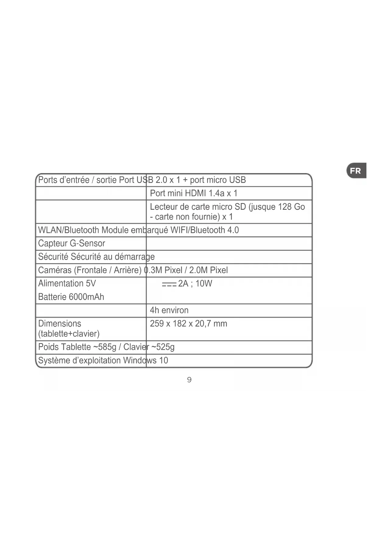Ports d’entrée / sortie Port USB 2.0 x 1 + port micro USB Port mini HDMI 1.4a x 1 Lecteur de carte micro SD (jusque 128 Go - carte non fournie) x 1 WLAN/Bluetooth Module embarqué WIFI/Bluetooth 4.0 Capteur G-Sensor Sécurité Sécurité au démarrage Caméras (Frontale / Arrière) 0.3M Pixel / 2.0M Pixel Alimentation 5V 2A ; 10W Batterie 6000mAh 4h environ Dimensions (tablette+clavier) 259 x 182 x 20,7 mm Poids Tablette ~585g / Clavier ~525g Système d’exploitation Windows 1010