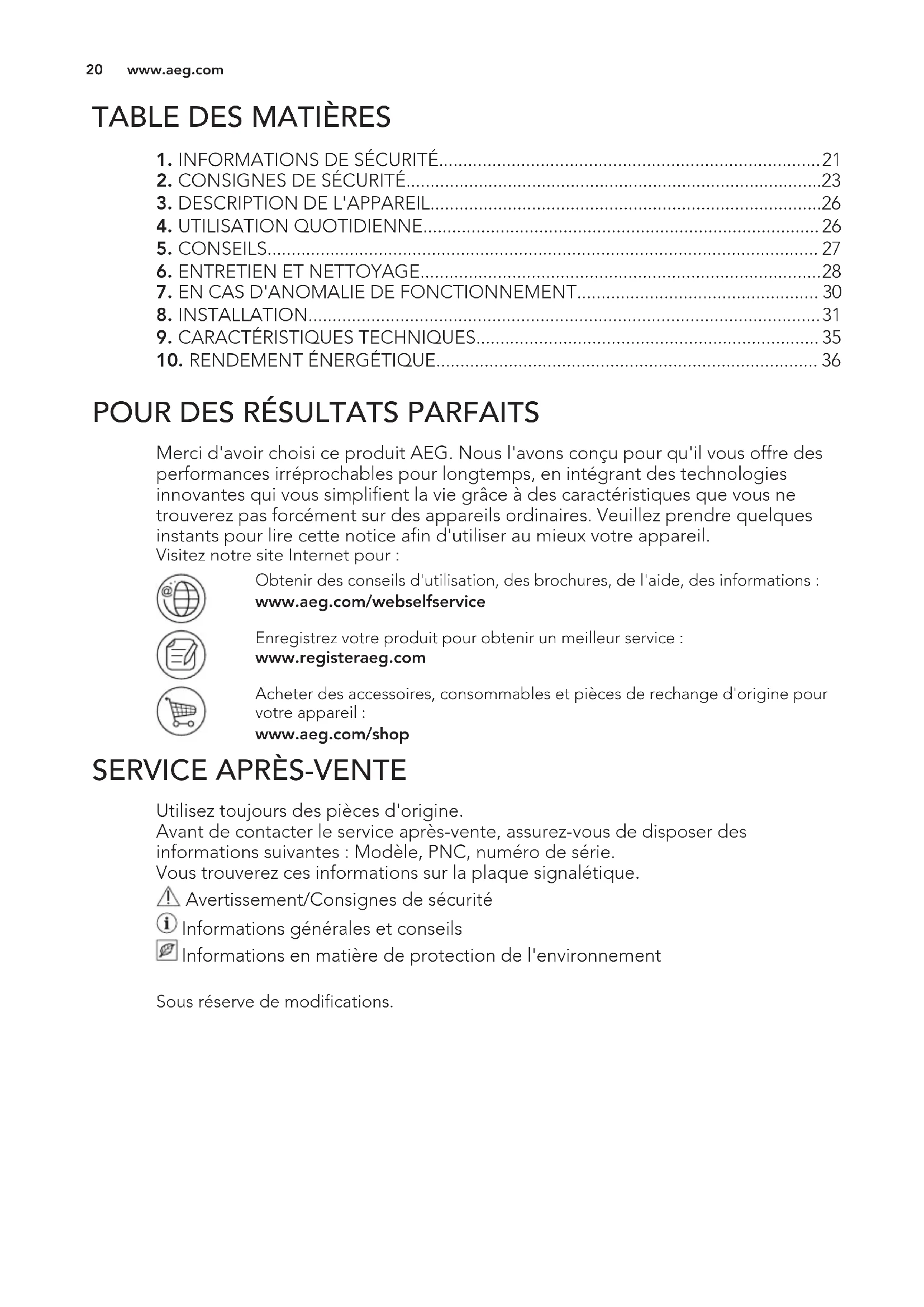 Merci d'avoir choisi ce produit AEG. Nous l'avons conçu pour qu'il vous offre des performances irréprochables pour longtemps, en intégrant des technologies innovantes qui vous simplifient la vie grâce à des caractéristiques que vous ne trouverez pas forcément sur des appareils ordinaires. Veuillez prendre quelques instants pour lire cette notice afin d'utiliser au mieux votre appareil. Visitez notre site Internet pour : Obtenir des conseils d'utilisation, des brochures, de l'aide, des informations : www.aeg.com/webselfservice Enregistrez votre produit pour obtenir un meilleur service : www.registeraeg.com Acheter des accessoires, consommables et pièces de rechange d'origine pour votre appareil : www.aeg.com/shop