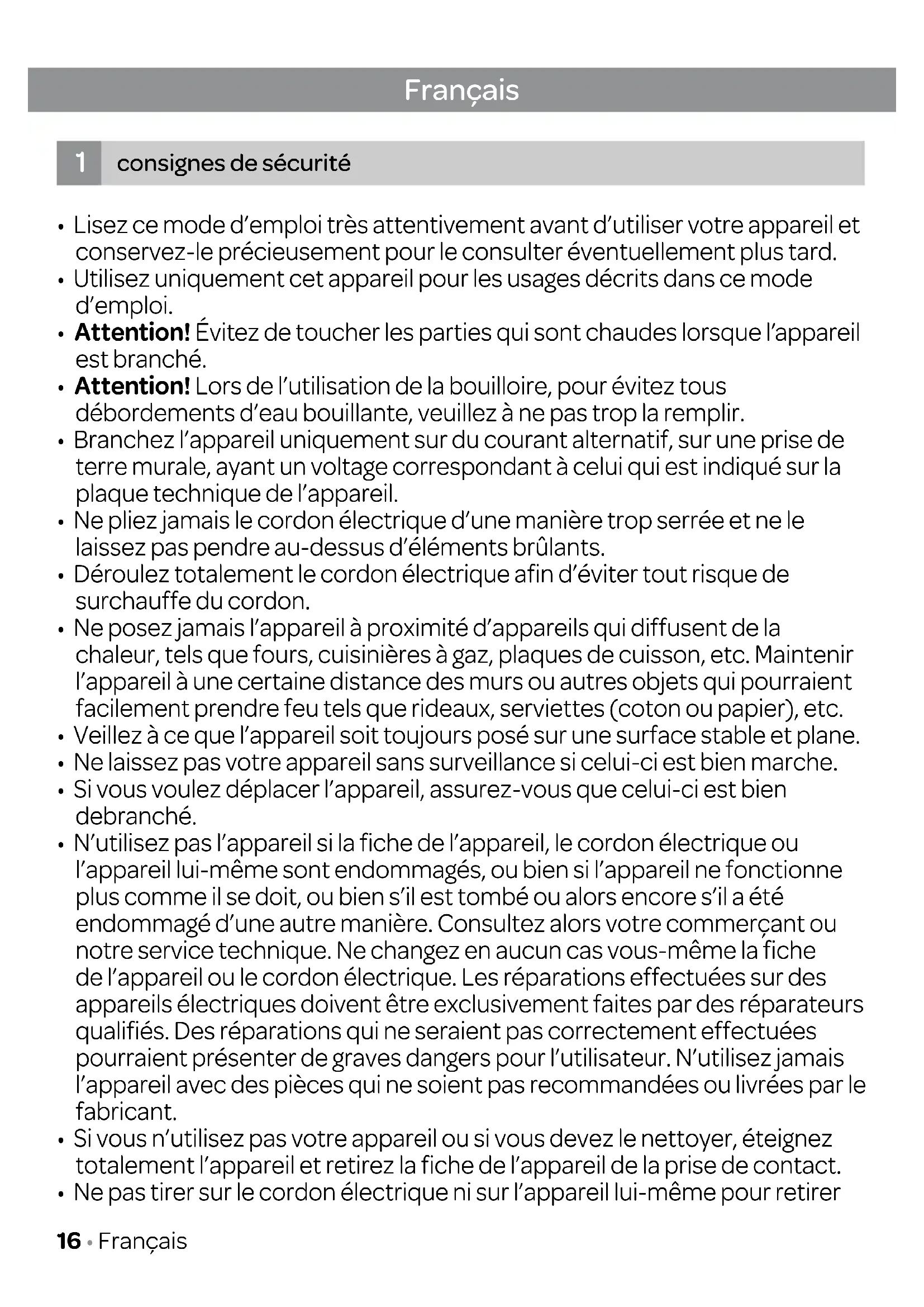 - Ne pas tirer sur le cordon électrique ni sur l'appareil lui-même pour-retirer
