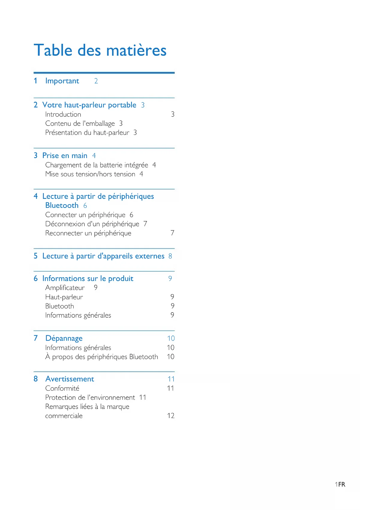 - La plaque signalétique est située sous l'appareil.3FR 2 Votre haut- parleur portable Félicitations pour votre achat et bienvenue dans lemondedePhilips!Pourproterpleinement de l'assistance offerte par Philips, enregistrez votre appareil à l'adresse suivante : www.philips. com/welcome. Introduction Cette enceinte vous permet de diffuser la musique de périphériques Bluetooth et d'autres appareils externes. Contenu de l'emballage Vériezetidentiezlesdifférentespièces contenues dans l'emballage :