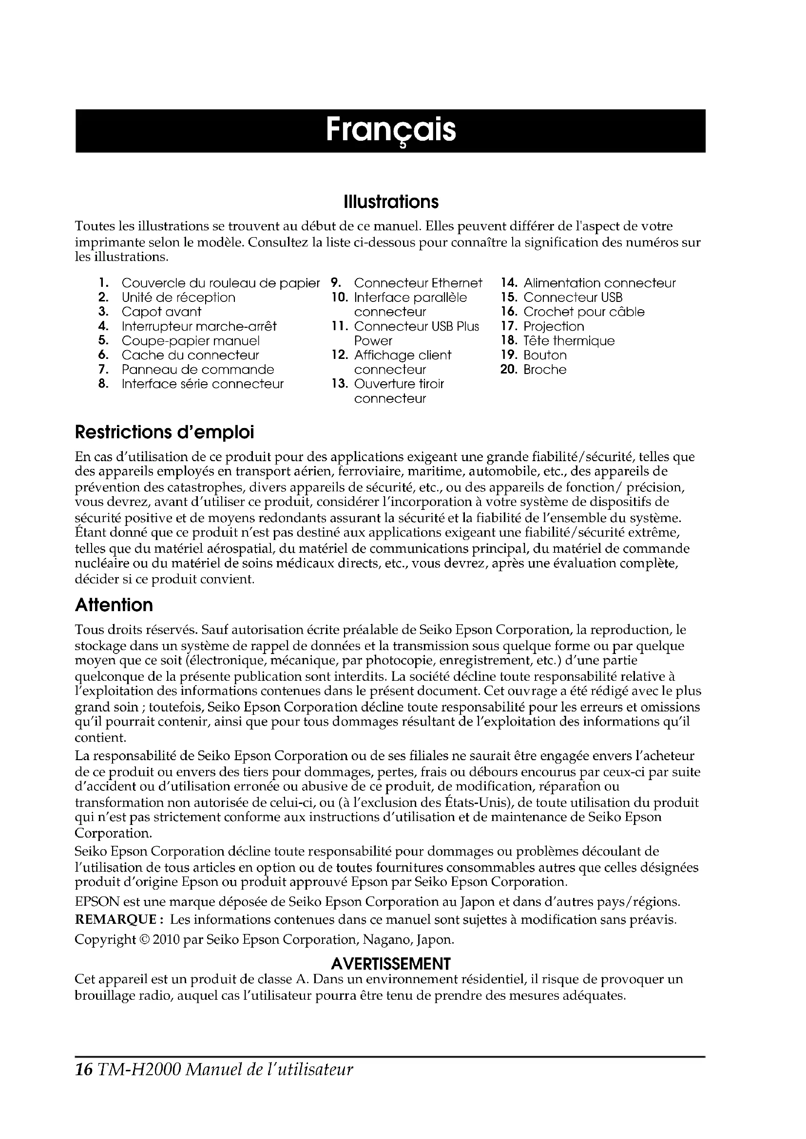 English Français Illustrations Toutes les illustrations se trouvent au début de ce manuel. Elles peuvent différer de l'aspect de votre imprimante selon le modèle. Consultez la liste ci-dessous pour connaître la signification des numéros sur les illustrations. Restrictions d’emploi En cas d’utilisation de ce produit pour des applications exigeant une grande fiabilité/sécurité, telles que des appareils employés en transport aérien, ferroviaire, maritime, automobile, etc., des appareils de prévention des catastrophes, divers appareils de sécurité, etc., ou des appareils de fonction/ précision, vous devrez, avant d’utiliser ce produit, considérer l’incorporation à votre système de dispositifs de sécurité positive et de moyens redondants assurant la sécurité et la fiabilité de l’ensemble du système. Étant donné que ce produit n’est pas destiné aux applications exigeant une fiabilité/sécurité extrême, telles que du matériel aérospatial, du matériel de communications principal, du matériel de commande nucléaire ou du matériel de soins médicaux directs, etc., vous devrez, après une évaluation complète, décider si ce produit convient. Attention Tous droits réservés. Sauf autorisation écrite préalable de Seiko Epson Corporation, la reproduction, le stockage dans un système de rappel de données et la transmission sous quelque forme ou par quelque moyen que ce soit (électronique, mécanique, par photocopie, enregistrement, etc.) d’une partie quelconque de la présente publication sont interdits. La société décline toute responsabilité relative à l’exploitation des informations contenues dans le présent document. Cet ouvrage a été rédigé avec le plus grand soin ; toutefois, Seiko Epson Corporation décline toute responsabilité pour les erreurs et omissions qu’il pourrait contenir, ainsi que pour tous dommages résultant de l’exploitation des informations qu’il contient. La responsabilité de Seiko Epson Corporation ou de ses filiales ne saurait être engagée envers l’acheteur de ce produit ou envers des tiers pour dommages, pertes, frais ou débours encourus par ceux-ci par suite d’accident ou d’utilisation erronée ou abusive de ce produit, de modification, réparation ou transformation non autorisée de celui-ci, ou (à l’exclusion des États-Unis), de toute utilisation du produit qui n’est pas strictement conforme aux instructions d’utilisation et de maintenance de Seiko Epson Corporation. Seiko Epson Corporation décline toute responsabilité pour dommages ou problèmes découlant de l’utilisation de tous articles en option ou de toutes fournitures consommables autres que celles désignées produit d’origine Epson ou produit approuvé Epson par Seiko Epson Corporation. EPSON est une marque déposée de Seiko Epson Corporation au Japon et dans d’autres pays/régions. REMARQUE : Les informations contenues dans ce manuel sont sujettes à modification sans préavis. Copyright © 2010 par Seiko Epson Corporation, Nagano, Japon. AVERTISSEMENT Cet appareil est un produit de classe A. Dans un environnement résidentiel, il risque de provoquer un brouillage radio, auquel cas l’utilisateur pourra être tenu de prendre des mesures adéquates.