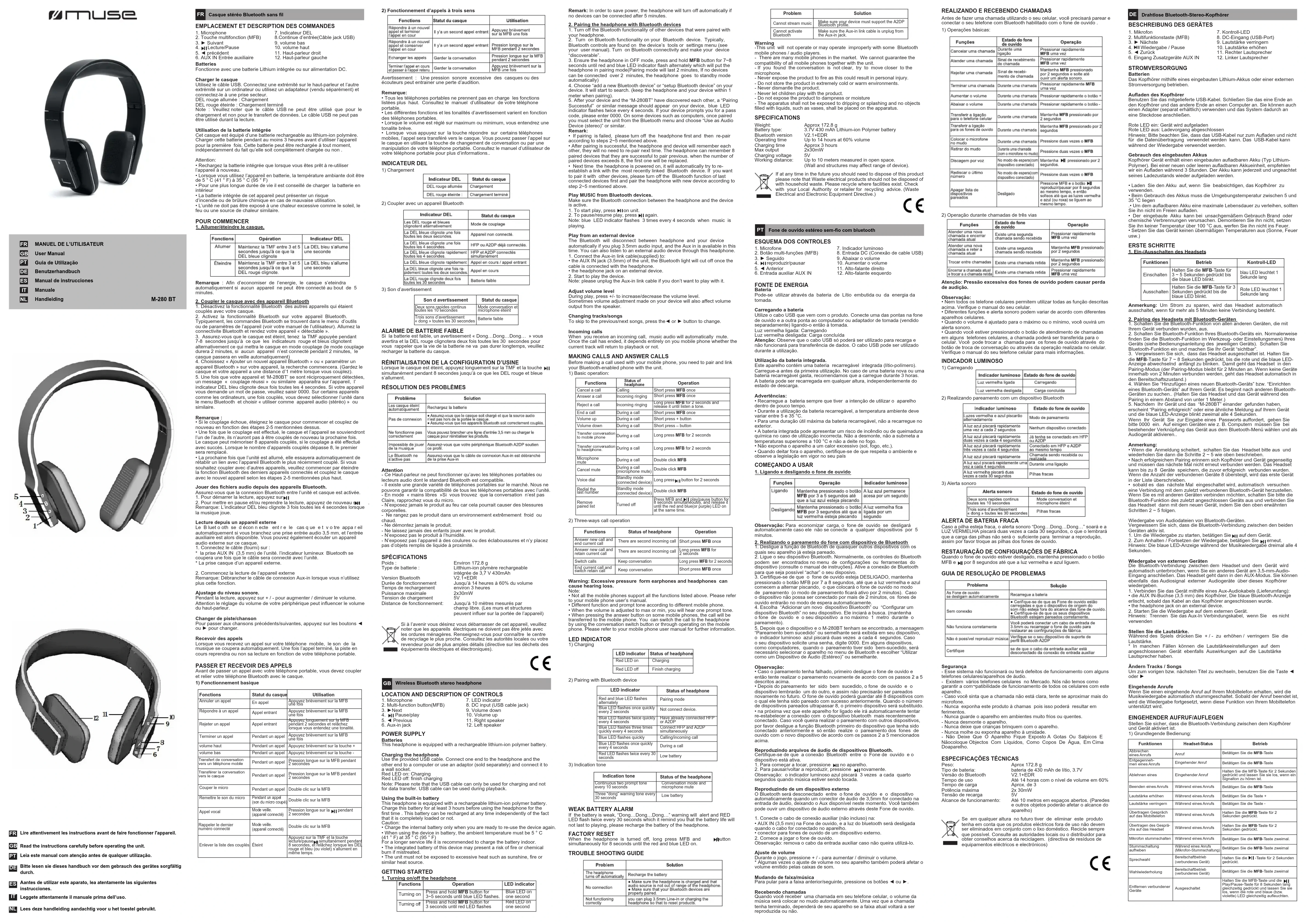 Drahtlose Bluetooth-Stereo-KopfhörerLire attentivement les instructions avant de faire fonctionner l'appareil. Read the instructions carefully before operating the unit. Leia este manual com atenção antes de qualquer utilização. Bitte lesen sie dieses handbuch vor dem gebrauch des gerätes sorgfältig durch. Aantes de utilizar este aparato, lea atentamente las siguientes instrucciones. Leggete attentamente il manuale prima dell’uso. Lees deze handleiding aandachtig voor u het toestel gebruikt. 1. Microphone2. Touche multifonction (MFB)3. ► Suivant4. Lecture/Pause5. ◄ précédent6. AUX IN Entrée auxiliaire7. Indicateur DEL8.Continue d’entrée(Câble jack USB)9. volume bas10. volume haut11. Haut-parleur droit12. Haut-parleur gaucheBatteriesFonctionne avec une batterie Lithium intégrée ou sur alimentation DC. Charger le casqueUtilisez le câble USB. Connectez une extrémité sur le haut-parleur et l’autre extrémité sur un ordinateur ou utilisez un adaptateur (vendu séparément) et connectez-le à une prise secteur.DEL rouge allumée : Chargement DEL rouge éteinte : Chargement terminéNote : Veuillez noter que le câble USB ne peut être utilisé que pour le chargement et non pour le transfert de données. Le câble USB ne peut pas être utilisé durant la lecture.Utilisation de la batterie intégréeCet casque est équipé d’une batterie rechargeable au lithium-ion polymère. Charger cette batterie pendant au moins 3 heures avant d’utiliser l’appareil pour la première fois. Cette batterie peut être rechargée à tout moment, indépendamment du fait qu’elle soit complètement chargée ou non .Attention:• Rechargez la batterie intégrée que lorsque vous êtes prêt à re-utiliser l’appareil à nouveau.• Lorsque vous utilisez l’appareil en batterie, la température ambiante doit être de 5 ° C (41 ° F) à 35 ° C (95 ° F)• Pour une plus longue durée de vie il est conseillé de charger la batterie en intérieur• La batterie intégrée de cet appareil peut présenter un risque d’incendie ou de brûlure chimique en cas de mauvaise utilisation. • L’unité ne doit pas être exposé à une chaleur excessive comme le soleil, le feu ou une source de chaleur similaire. POUR COMMENCER 1. Allumer/éteindre le casque.Remarque : Afin d’economiser de l’energie, le casque s’eteindra automatiquement si aucun appareil ne peut être connecté au bout de 5 minutes.2. Coupler le casque avec des appareil Bluetooth1. Désactivez la fonctionnalité Bluetooth des autres appareils qui étaient couplés avec votre casque.2. Activez la fonctionnalité Bluetooth sur votre appareil Bluetooth. Typiquement, les commandes Bluetooth se trouvent dans le menu d’outils ou de paramètres de l’appareil (voir votre manuel de l’utilisateur). Allumez la connectivite Bluetooth et rendez votre appareil « détectable ».3. Assurez-vous que le casque est éteint, tenez la TMF appuyée pendant 7-8 secondes jusqu’à ce que les indicateurs rouge et bleus clignotent alternativement ce qui mettra le casque en mode couplage (le mode couplage durera 2 minutes, si aucun appareil n’est connecté pendant 2 minutes, le casque passera en veille automatiquement)4. Choisissez « Ajouter un nouvel appareil Bluetooth » ou « paramétrer un appareil Bluetooth » sur votre appareil, la recherche commencera. (Gardez le casque et votre appareil a une distance d’1 mètre lorsque vous couplez). 5. Une fois que votre appareil et ‘M-280BT’ se sont réciproquement détectées, un message « couplage réussi » ou similaire apparaitra sur l’appareil, l’indicateur DEL bleu clignote deux fois toutes les 4 secondes. Si votre appareil vous demande un mot de passe, veuillez saisir 0000. Sur certains appareils comme les ordinateurs, une fois couplés, vous devez sélectionner l’unité dans le menu Bluetooth et choisir « utiliser comme appareil audio (stéréo) » ou similaire.Remarque :• Si le couplage échoue, éteignez le casque pour commencer et couplez de nouveau en fonction des étapes 2-5 mentionnées dessus.• Une fois que le couplage est effectué, le casque et l’appareil se souviendront l’un de l’autre, ils n’auront pas à être couplés de nouveau la prochaine fois. Le casque peut mémoriser 8 appareils couplés, si le couplage a été effectué avec succès. Lorsque le nombre d’appareils couplés dépasse 8, le premier sera remplacé.• La prochaine fois que l’unité est allumé, elle essayera automatiquement de rétablir un lien avec l’appareil Bluetooth le plus récemment couplé. Si vous souhaitez coupler avec d’autres appareils, veuillez commencer par éteindre la fonction Bluetooth des derniers appareils connectés et couplez le casque avec le nouvel appareil selon les étapes 2-5 mentionnées plus haut.Jouer des chiers audio depuis des appareils Bluetooth.Assurez-vous que la connexion Bluetooth entre l’unité et casque est activée. 1. Pour démarrer la lecture, appuyez sur 2. Pour mettre en pause et/ou reprendre la lecture, appuyez de nouveau sur .Remarque: L’indicateur DEL bleu clignote 3 fois toutes les 4 secondes lorsque la musique joue.Lecture depuis un appareil externeLe B luet o oth se d écon n ecte ent r e le cas q ue e t v o tre appa r eil automatiquement si vous branchez une prise entrée audio 3,5 mm, et l’entrée auxiliaire est alors disponible. Vous pouvez également écouter un appareil audio externe sur ce casque. 1. Connectez le câble (fourni) sur :* la prise AUX IN (3,5 mm) de l’unité. l’indicateur lumineux Bluetooth se coupera une fois que le câble sera connecté avec l’unité.* La prise casque d’un appareil externe.2. Commencez la lecture de l’appareil externeRemarque: Débrancher le câble de connexion Aux-in lorsque vous n’utilisez plus cette fonction.Ajustage du niveau sonore.Pendant la lecture, appuyez sur + / - pour augmenter / diminuer le volume.Attention le réglage du volume de votre périphérique p