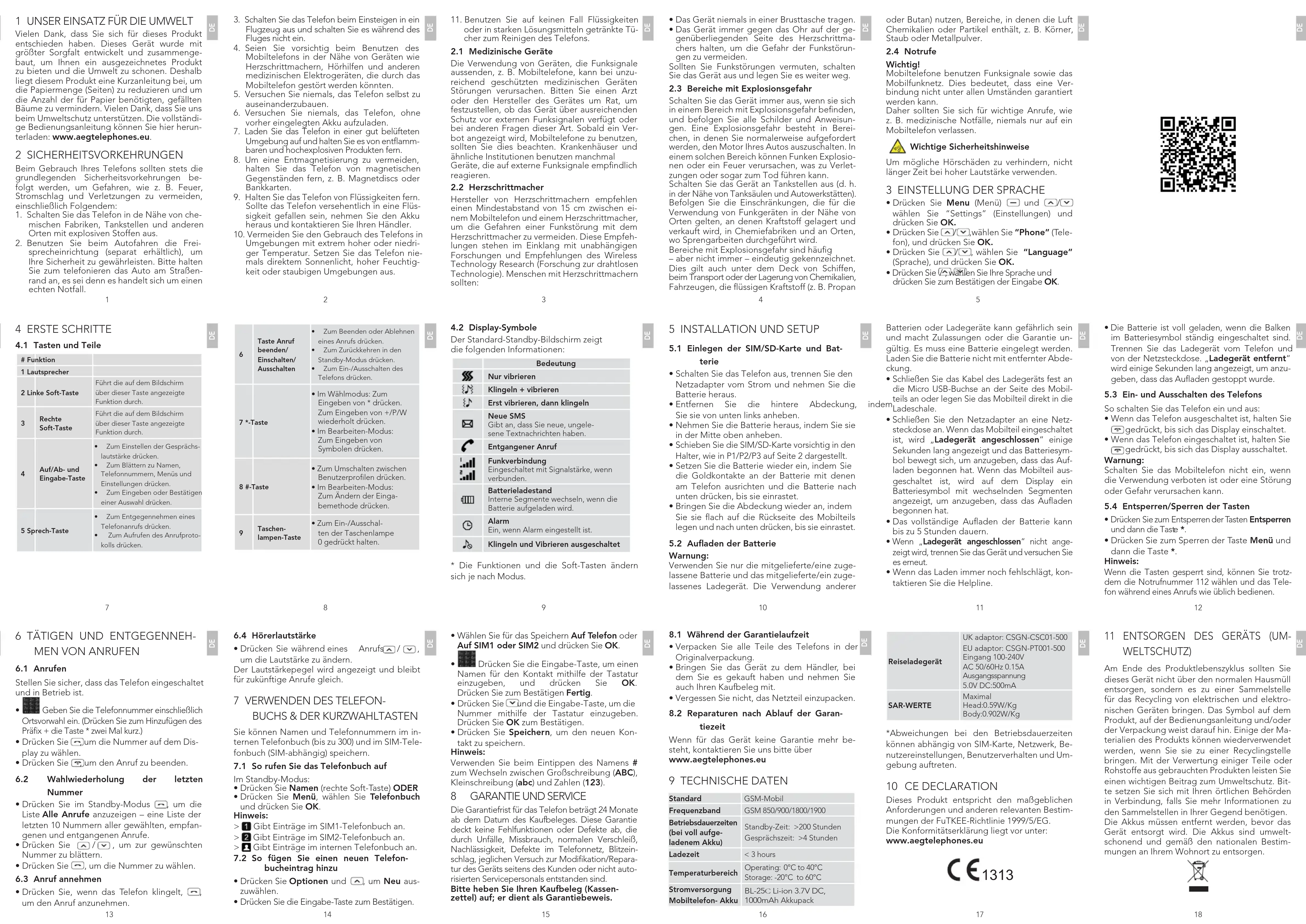 1 NOTRE ENGAGEMENT Merci d’avoir acheté ce produit. Ce produit a été conçu et fabriqué avec le plus grand soin pour vous satisfaire tout en préservant l’environnement. C’est pourquoi nous fournissons ce produit avec une guide de démarrage rapide, afin de réduire la quantité de papier (le nombre de pages) utilisée et d’éviter ainsi à des arbres d’être abattus pour fa- briquer ce papier. Merci de nous aider à protéger l’environnement. Le guide de l’utilisateur complet est disponible sur www.aegtelephones.eu.