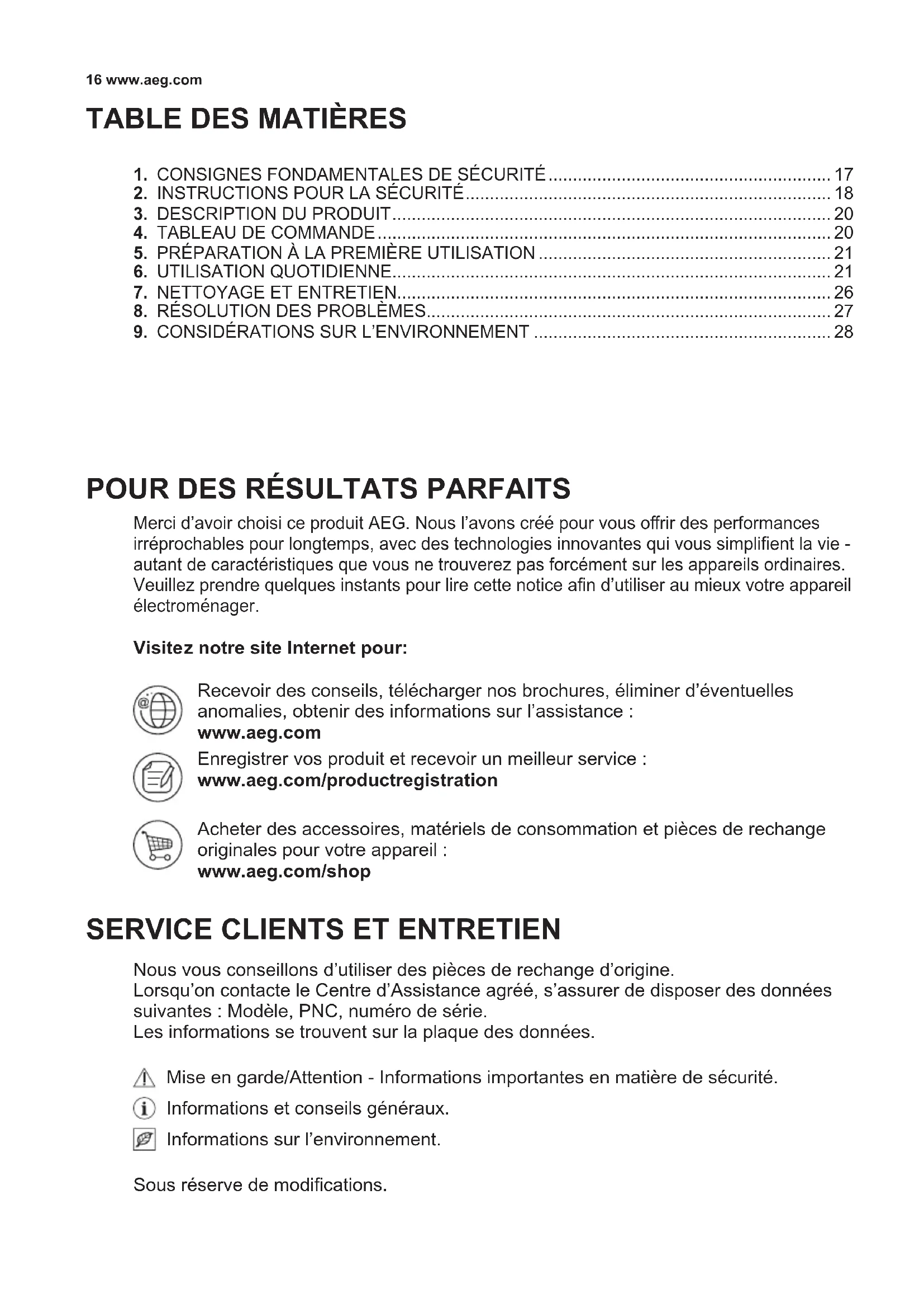 Merci d’avoir choisi ce produit AEG. Nous l’avons créé pour vous orir des performances irréprochables pour longtemps, avec des technologies innovantes qui vous simplient la vie - autant de caractéristiques que vous ne trouverez pas forcément sur les appareils ordinaires. Veuillez prendre quelques instants pour lire cette notice an d’utiliser au mieux votre appareil électroménager. Visitez notre site Internet pour: Recevoir des conseils, télécharger nos brochures, éliminer d’éventuelles anomalies, obtenir des informations sur l’assistance : www.aeg.com Enregistrer vos produit et recevoir un meilleur service : www.aeg.com/productregistration Acheter des accessoires, matériels de consommation et pièces de rechange originales pour votre appareil : www.aeg.com/shop