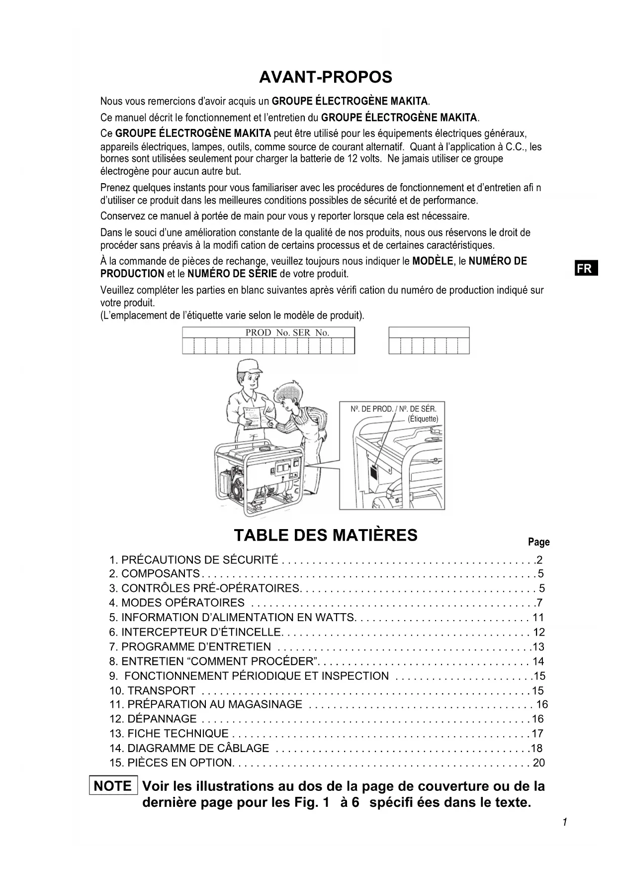 Nous vous remercions d’avoir acquis un GROUPE ÉLECTROGÈNE MAKITA. Ce manuel décrit le fonctionnement et l’entretien du GROUPE ÉLECTROGÈNE MAKITA. Ce GROUPE ÉLECTROGÈNE MAKITA peut être utilisé pour les équipements électriques généraux, appareils électriques, lampes, outils, comme source de courant alternatif. Quant à l’application à C.C., les bornes sont utilisées seulement pour charger la batterie de 12 volts. Ne jamais utiliser ce groupe électrogène pour aucun autre but. Prenez quelques instants pour vous familiariser avec les procédures de fonctionnement et d’entretien a n d’utiliser ce produit dans les meilleures conditions possibles de sécurité et de performance. Conservez ce manuel à portée de main pour vous y reporter lorsque cela est nécessaire. Dans le souci d’une amélioration constante de la qualité de nos produits, nous ous réservons le droit de procéder sans préavis à la modi cation de certains processus et de certaines caractéristiques. À la commande de pièces de rechange, veuillez toujours nous indiquer le MODÈLE, le NUMÉRO DE PRODUCTION et le NUMÉRO DE SÉRIE de votre produit. Veuillez compléter les parties en blanc suivantes après véri cation du numéro de production indiqué sur votre produit. (L’emplacement de l’étiquette varie selon le modèle de produit). NOTE Voir les illustrations au dos de la page de couverture ou de la dernière page pour les Fig. à spécifi ées dans le texte. PROD No. SER No.Nº. DE PROD. / Nº. DE SÉR. (Étiquette)