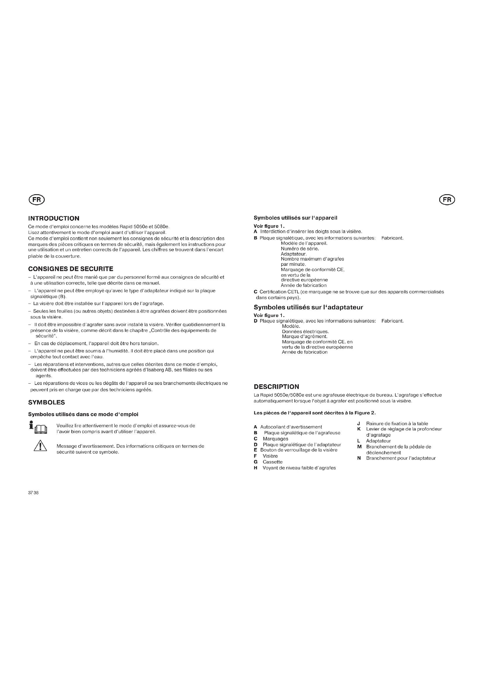 Symboles utilisés sur l‘appareil Voir figure 1. A Interdiction d‘insérer les doigts sous la visière. B Plaque signalétique, avec les informations suivantes: Fabricant. Modèle de l‘appareil. Numéro de série. Adaptateur. Nombre maximum d‘agrafes par minute. Marquage de conformité CE, en vertu de la directive européenne Année de fabrication C Certification CETL (ce marquage ne se trouve que sur des appareils commercialisés dans certains pays). Symboles utilisés sur l‘adaptateur Voir figure 1. D Plaque signalétique, avec les informations suivantes: Fabricant. Modèle. Données électriques. Marque d‘agrément. Marquage de conformité CE, en vertu de la directive européenne Année de fabrication DESCRIPTION La Rapid 5050e/5080e est une agrafeuse électrique de bureau. L‘agrafage s‘effectue automatiquement lorsque l‘objet à agrafer est positionné sous la visière. Les pièces de l‘appareil sont décrites à la Figure 2. A Autocollant d‘avertissement B Plaque signalétique de l‘agrafeuse C Marquages D Plaque signalétique de l‘adaptateur E Bouton de verrouillage de la visière F Visière G Cassette H Voyant de niveau faible d‘agrafes J Rainure de fixation à la table K Levier de réglage de la profondeur d‘agrafage L Adaptateur M Branchement de la pédale de déclenchement N Branchement pour l‘adaptateur