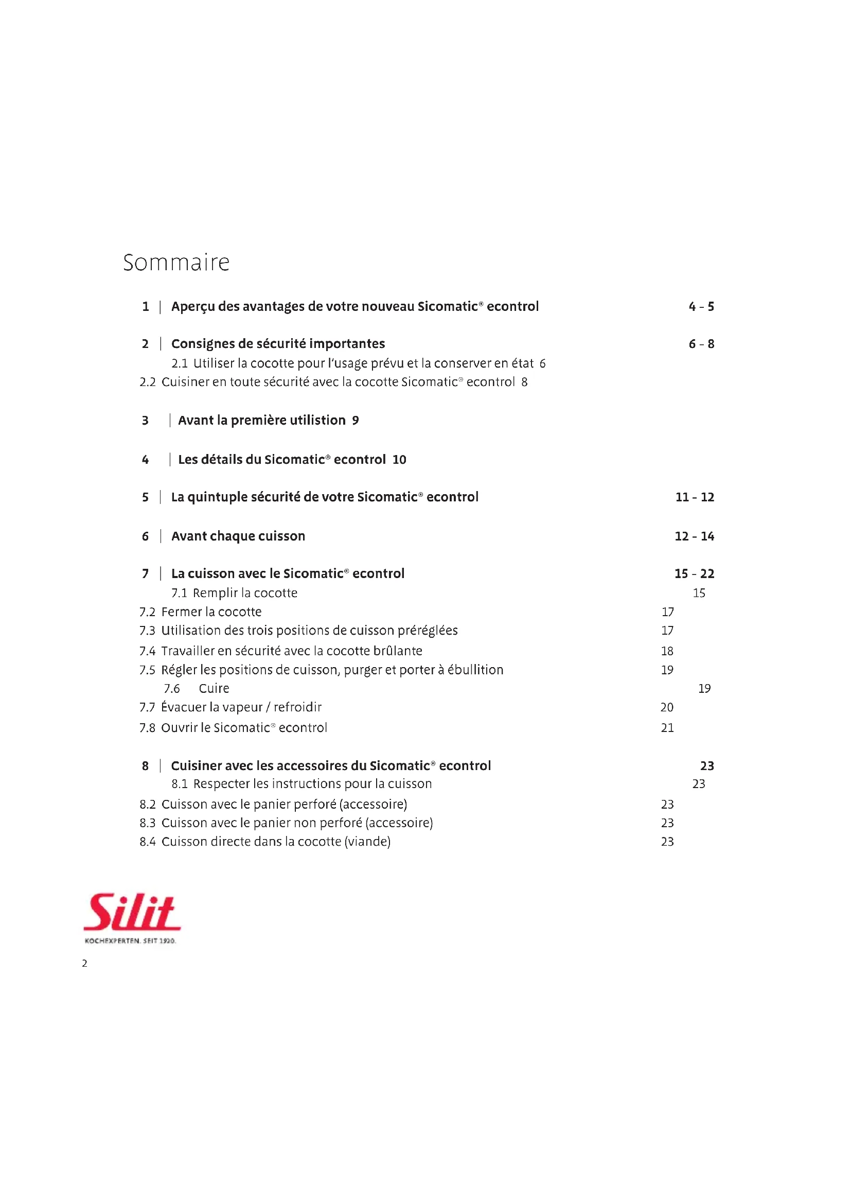 3 | Avant la première utilistion 9 4 | Les détails du Sicomatic® econtrol 10 5 | La quintuple sécurité de votre Sicomatic® econtrol 11 - 12 6 | Avant chaque cuisson 12 - 14 7 | La cuisson avec le Sicomatic® econtrol 15 - 22