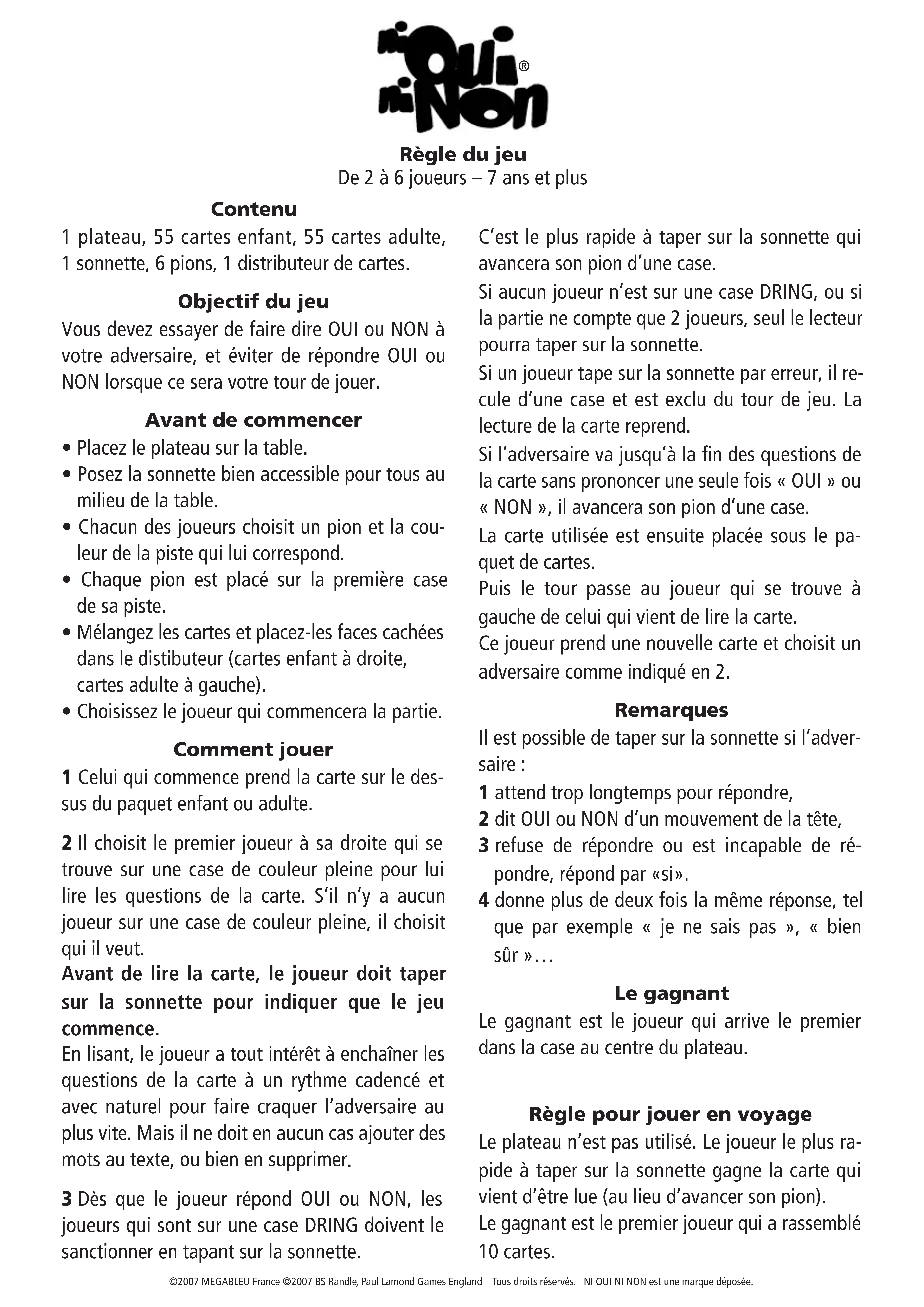 Ni Oui Ni Non - Jeu de société MEGABLEU - Notice d'utilisation et mode d'emploi gratuit