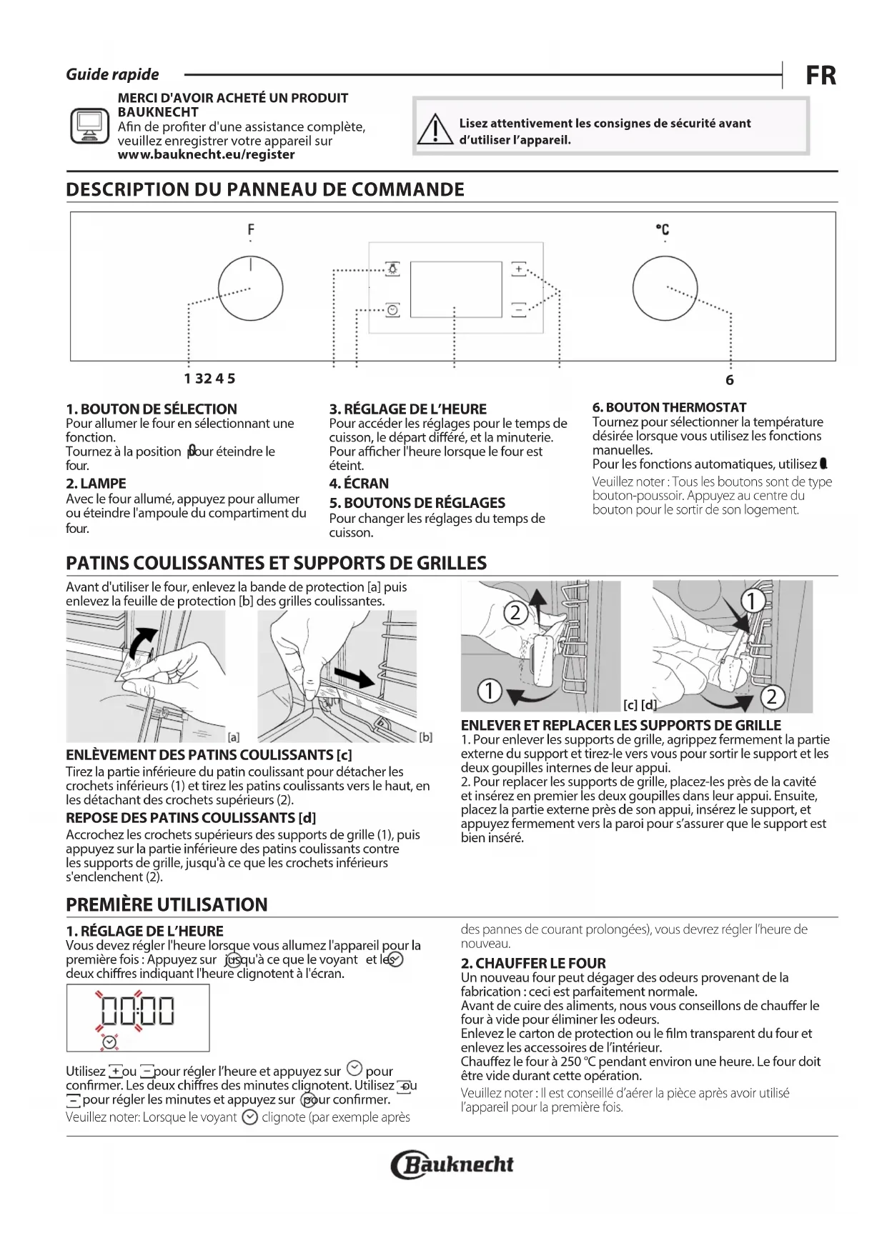- Alternatively, contact our After-sales Service (See phone number in the warranty booklet). When contacting our After-sales Service, please state the codes provided on your product's identication plate. XXXXXXXXXXXXXX Model: xxxXXXXxx Download the complete Use and Care Guide from docs.bauknecht.eu for more informations about your productFR Guide rapideDESCRIPTION DU PANNEAU DE COMMANDE1. BOUTON DE SÉLECTIONPour allumer le four en sélectionnant une fonction.Tournez à la position pour éteindre le four.2. LAMPEAvec le four allumé, appuyez pour allumer ou éteindre l'ampoule du compartiment du four.3. RÉGLAGE DE L’HEUREPour accéder les réglages pour le temps de cuisson, le départ diéré, et la minuterie. Pour acher l'heure lorsque le four est éteint.4. ÉCRAN5. BOUTONS DE RÉGLAGESPour changer les réglages du temps de cuisson.6. BOUTON THERMOSTATTournez pour sélectionner la température désirée lorsque vous utilisez les fonctions manuelles.Pour les fonctions automatiques, utilisez Veuillez noter: Tous les boutons sont de type bouton-poussoir. Appuyez au centre du bouton pour le sortir de son logement.1 32 4 5 PATINS COULISSANTES ET SUPPORTS DE GRILLESAvant d'utiliser le four, enlevez la bande de protection [a] puis enlevez la feuille de protection [b] des grilles coulissantes.ENLÈVEMENT DES PATINS COULISSANTS [c]Tirez la partie inférieure du patin coulissant pour détacher les crochets inférieurs (1) et tirez les patins coulissants vers le haut, en les détachant des crochets supérieurs (2).REPOSE DES PATINS COULISSANTS [d]Accrochez les crochets supérieurs des supports de grille (1), puis appuyez sur la partie inférieure des patins coulissants contre les supports de grille, jusqu'à ce que les crochets inférieurs s'enclenchent (2).