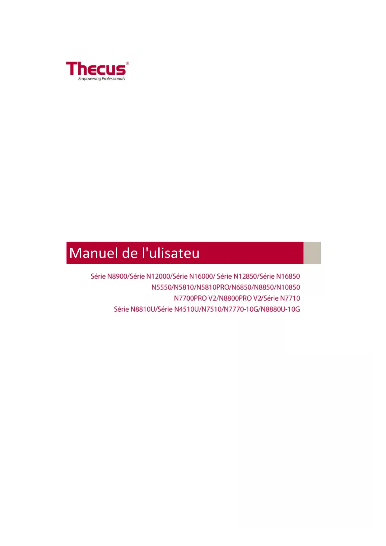 - Manuel de l'utilisateu2 Copyright et marques déposées Thecus et les autres noms des produits Thecus sont des marques déposées de Thecus Technology Corp. Microsoft, Windows et le logo Windows sont des marques déposées de Microsoft Corporation. Apple, iTunes and Apple OS X sont des marques déposéees de Apple Computers, Inc. Toutes les autres marques déposées et commerciales demeurent la propriété de leurs détenteurs respectifs. Spécifications sujettes à modification sans préavis. Copyright © 2016 Thecus Technology Corporation. Tous droits réservés. À propos de ce manuel Les informations contenues dans ce manuel ont été vérifiées attentivement pour s'assurer qu'elles sont correctes. Dans le cas d'une erreur, veuillez nous contacter avec vos commentaires. Thecus Technology Corporation se réserve le droit d'apporter des modifications au contenu de ce manuel sans préavis. Nom du produit : Thecus Série N8900/Série N12000/Série N16000/ Série N12850/Série N16850/N5550/N6850/N8850/N10850/N7700PRO V2/N8800PRO V2/ Série N7710/Série N8810U/ Série N4510U/N7510/N5810/N5810PRO/ N7770-10G/N8880U-10G Version du manuel :6.3 Date de mise en circulation : Octobre 2015 Garantie limité e Thecus Technology Corporation garantit que tous les composants des produits Thecus NAS ont été testés minutieusement avant de quitter l'usine et que cet appareil fonctionne normalement dans des conditions normales d'utilisation. Dans le cas improbable d'un dysfonctionnement du système, Thecus Technology Corporation et ses représentants locaux et revendeurs sont responsables des réparations, sans aucun coût pour le client, si le produit arrête de fonctionner normalement pendant la période de garantie et dans des conditions normales d'utilisation. Thecus Technology Corporation n'assume aucune responsabilité en cas de dommage ou de perte de données, même si cela est causé par ses produits. Nous recommandons vivement aux utilisateurs de sauvegarder régulièrement leurs données.3 Mises en garde de sécurité Veuillez lire attentivement et suivre les instructions de cette section pour votre sécurité : Lisez attentivement ce manuel avant d'installer votre Thecus IP storage. Votre Thecus IP storage est un appareil électronique sophistiqué. N'essayez en AUCUN CAS de réparer cet appareil par vous-même. En cas de dysfonctionnement, coupez immédiatement l'alimentation et faites réparer l'appareil dans un centre de réparation agréé. Contactez votre revendeur pour plus de détails. NE POSEZ aucun objet sur le cordon d'alimentation et installez le cordon de façon à ce que PERSONNE ne puisse trébucher ou marcher dessus. Installez les câbles de connexion de façon à ce que personne ne puisse trébucher ou marcher dessus. Votre Thecus IP storage fonctionnera normalement dans des endroits avec une temprature comprise entre 0°C et 40°C et une humidité entre 20% et 85%. L'utilisation du Thecus IP storage dans des conditions environnementales extrêmes risque d'endommager l'unité. Vérifiez que la source d'alimentation utilisée pour alimenter le Thecus IP storage est du bon type. Le fait de brancher le Thecus IP storage sur une source d'alimentation erronée risque d'endommager l'unité. NE PAS exposer le Thecus IP storage à l'humidité, à la poussière ou à des liquides corrosifs. NE PAS placer le Thecus IP storage sur une surface irrégulière. NE PAS exposer le Thecus IP storage directement au soleil, ni à d'autres sources de chaleur. NE PAS utiliser de produtis chimiques ou aérosols pour nettoyer le Thecus IP storage. Débranchez le cordon d'alimentation et tous les câbles avant de le nettoyer. NE PAS poser des objets sur le Thecus IP storage, ni obstruer les orifices de ventilation pour éviter que l'appareil ne surchauffe. Gardez l'emballage hors de portée des enfants. Lorsque vous voulez jetez l'appareil, respectez toujours la règlementation locale concernant la mise au rebut en toute sécurité des produits électroniques pour protéger l'environnement. Risque d'explosion si la batterie est remplacée par un type incorrect. Mettez au rebut les batteries usagées conformément aux instructions.4 Table des matières Copyright et marques déposé es p. 2