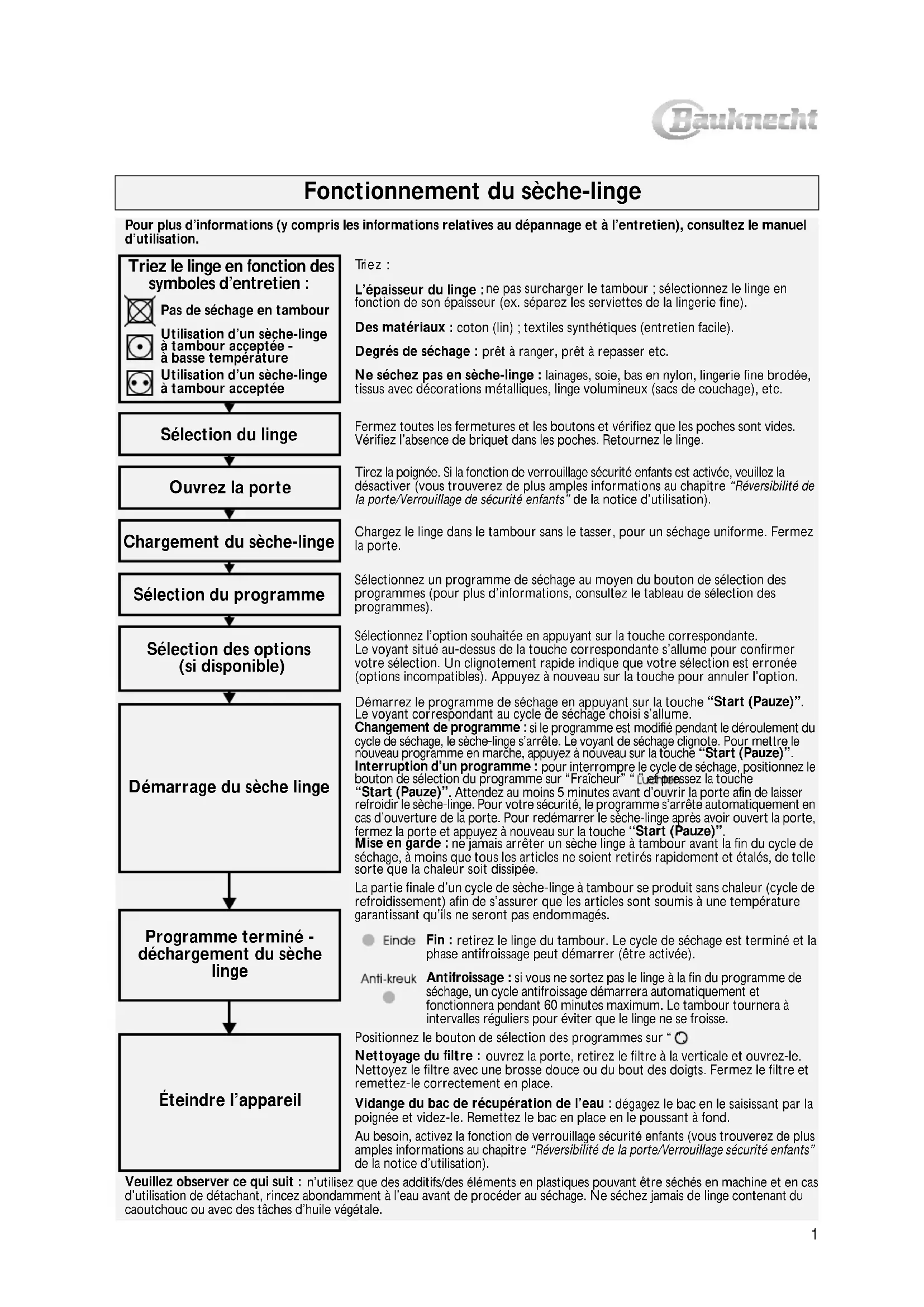 Fonctionnement du sèche-linge Pour plus d’informations (y compris les informations relatives au dépannage et à l’entretien), consultez le manuel d’utilisation. Tri e z : L’épaisseur du linge : ne pas surcharger le tambour ; sélectionnez le linge en fonction de son épaisseur (ex. séparez les serviettes de la lingerie fine). Des matériaux : coton (lin) ; textiles synthétiques (entretien facile). Degrés de séchage : prêt à ranger, prêt à repasser etc. Ne séchez pas en sèche-linge : lainages, soie, bas en nylon, lingerie fine brodée, tissus avec décorations métalliques, linge volumineux (sacs de couchage), etc. Fermez toutes les fermetures et les boutons et vérifiez que les poches sont vides. Vérifiez l’absence de briquet dans les poches. Retournez le linge. Tirez la poignée. Si la fonction de verrouillage sécurité enfants est activée, veuillez la désactiver (vous trouverez de plus amples informations au chapitre “Réversibilité de la porte/Verrouillage de sécurité enfants” de la notice d’utilisation). Chargez le linge dans le tambour sans le tasser, pour un séchage uniforme. Fermez la porte. Sélectionnez un programme de séchage au moyen du bouton de sélection des programmes (pour plus d’informations, consultez le tableau de sélection des programmes). Sélectionnez l’option souhaitée en appuyant sur la touche correspondante. Le voyant situé au-dessus de la touche correspondante s’allume pour confirmer votre sélection. Un clignotement rapide indique que votre sélection est erronée (options incompatibles). Appuyez à nouveau sur la touche pour annuler l’option. Démarrez le programme de séchage en appuyant sur la touche “Start (Pauze)”