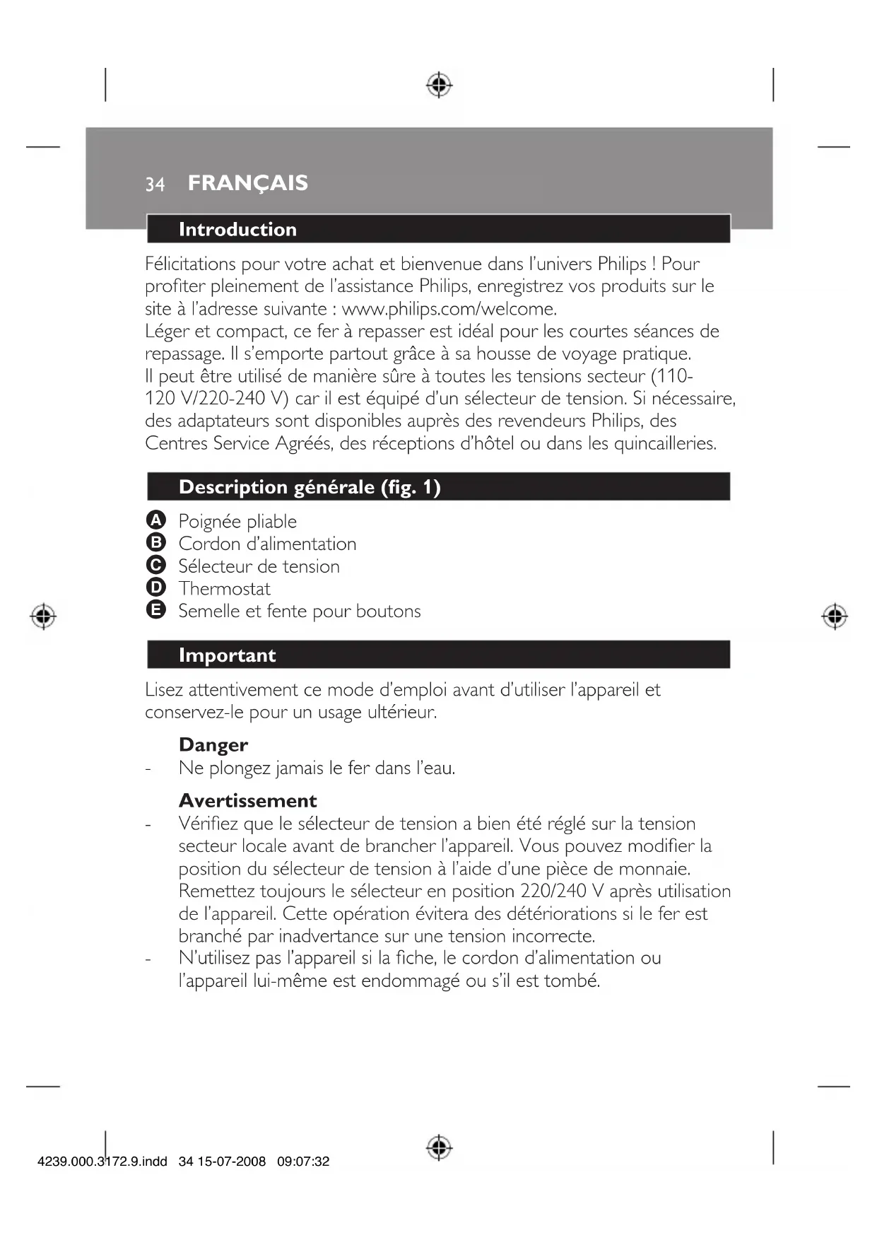 SUOMI 33 4239.000.3172.9.indd 33 15-07-2008 09:07:3234 Introduction Félicitations pour votre achat et bienvenue dans l’univers Philips ! Pour proter pleinement de l’assistance Philips, enregistrez vos produits sur le site à l’adresse suivante : www.philips.com/welcome. Léger et compact, ce fer à repasser est idéal pour les courtes séances de repassage. Il s’emporte partout grâce à sa housse de voyage pratique. Il peut être utilisé de manière sûre à toutes les tensions secteur (110- 120 V/220-240 V) car il est équipé d’un sélecteur de tension. Si nécessaire, des adaptateurs sont disponibles auprès des revendeurs Philips, des Centres Service Agréés, des réceptions d’hôtel ou dans les quincailleries. Description générale (g. 1) A Poignée pliable B Cordon d’alimentation C Sélecteur de tension D Thermostat E Semelle et fente pour boutons Important Lisez attentivement ce mode d’emploi avant d’utiliser l’appareil et conservez-le pour un usage ultérieur. Danger Ne plongez jamais le fer dans l’eau. Avertissement Vériez que le sélecteur de tension a bien été réglé sur la tension secteur locale avant de brancher l’appareil. Vous pouvez modier la position du sélecteur de tension à l’aide d’une pièce de monnaie. Remettez toujours le sélecteur en position 220/240 V après utilisation de l’appareil. Cette opération évitera des détériorations si le fer est branché par inadvertance sur une tension incorrecte. N’utilisez pas l’appareil si la che, le cordon d’alimentation ou l’appareil lui-même est endommagé ou s’il est tombé.