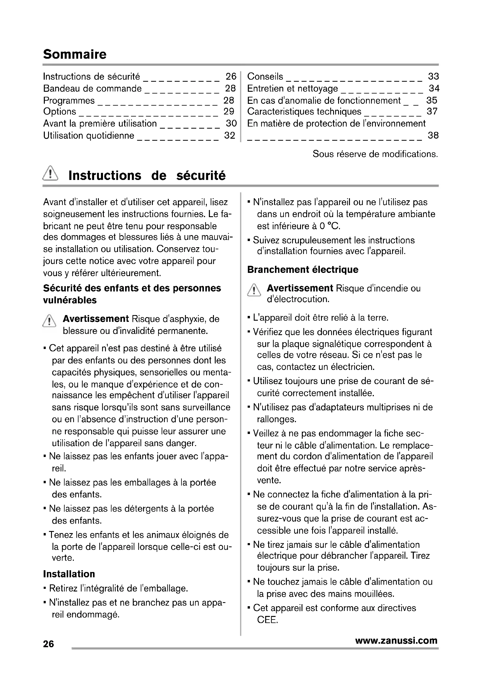 www.zanussi.comSommaire Instructions de sécurité _ _ _ _ _ _ _ _ _ _ 26 Bandeau de commande _ _ _ _ _ _ _ _ _ _ 28 Programmes _ _ _ _ _ _ _ _ _ _ _ _ _ _ _ _ 28 Options _ _ _ _ _ _ _ _ _ _ _ _ _ _ _ _ _ _ _ 29 Avant la première utilisation _ _ _ _ _ _ _ _ 30 Utilisation quotidienne _ _ _ _ _ _ _ _ _ _ _ 32 Conseils _ _ _ _ _ _ _ _ _ _ _ _ _ _ _ _ _ _ 33 Entretien et nettoyage _ _ _ _ _ _ _ _ _ _ _ 34 En cas d'anomalie de fonctionnement _ _ 35 Caracteristiques techniques _ _ _ _ _ _ _ _ 37 En matière de protection de l'environnement _ _ _ _ _ _ _ _ _ _ _ _ _ _ _ _ _ _ _ _ _ _ _ 38 Sous réserve de modifications. Instructions de sécurité Avant d'installer et d'utiliser cet appareil, lisez soigneusement les instructions fournies. Le fa- bricant ne peut être tenu pour responsable des dommages et blessures liés à une mauvai- se installation ou utilisation. Conservez tou- jours cette notice avec votre appareil pour vous y référer ultérieurement. Sécurité des enfants et des personnes vulnérables Avertissement Risque d'asphyxie, de blessure ou d'invalidité permanente.