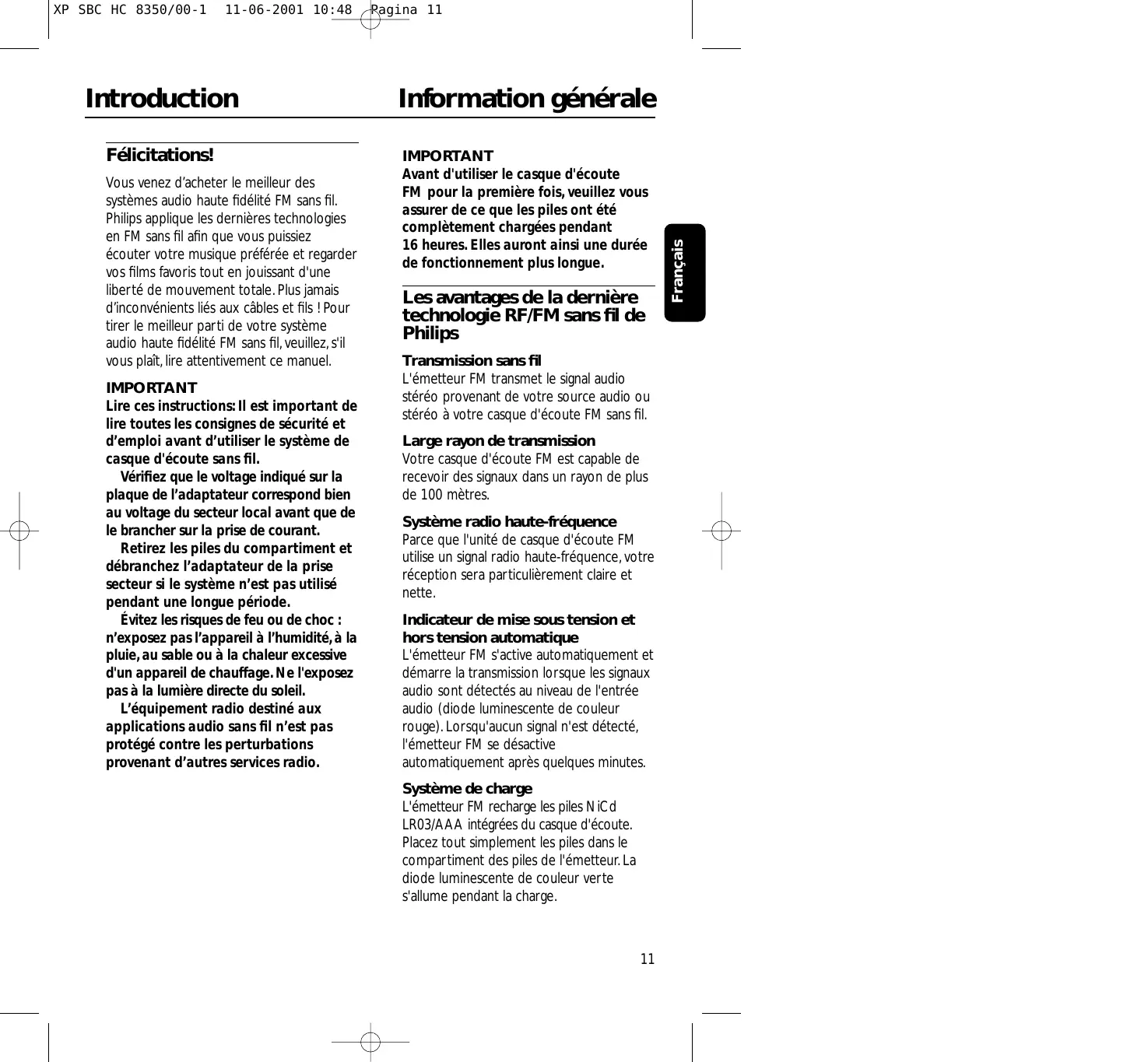 11-06-2001 10:48 Information générale Transmission facile Le casque d'écoute FM est capable de recevoir des signaux de l'émetteur, et ce, même à travers des obstacles tels que portes, murs, fenêtres. Français Plusieurs casques fonctionnant sur un seul émetteur Il est possible d'utiliser un certain nombre de casques d'écoute supplémentaires et ou des haut-parleurs sans fils sur un seul émetteur si ces appareils sont capables: - de fonctionner dans la bande 864 MHz - de détecter un ton pilote de 19 kHz. Pour vérifier la compatibilité, veuillez consulter les fiches de spécification électrique de l'appareil. Contenu de l'équipement Ce système de casque FM comprend les accessoires suivants: 1 x émetteur FM SBC HC8352 1 x casque FM SBC HC8355 1 x adaptateur CA/CC 12 Volt/200 mA SBC CS030/00 2 x piles rechargeables LR03/AAA (NiCd), 550 mAh 1 x fiche adaptatrice stéréo de 3,5 mm à 6,3 mm 1 x tube d'antenne Émetteur (figure 1) 1 Indicateur de charge – la diode luminescente de couleur verte s'allume lors du rechargement. Des piles complètement déchargées arriveront à charge complète après 16 heures de charge.