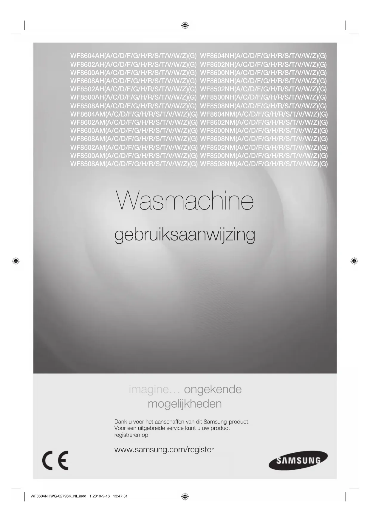 tr/min 1200 1000 800 L’aspect et les caractéristiques du produit peuvent faire l’objet de modifications sans préavis à des fins d’amélioration. WF8604NHWG-02796K_FR.indd 38 2010-9-16 13:43:01memo WF8604NHWG-02796K_FR.indd 39 2010-9-16 13:43:01DES QUESTIONS OU DES COMMENTAIRES ? Pays TÉLÉPHONE SITE INTERNET NETHERLANDS 0900-SAMSUNG (0900-7267864) (€ 0,10/ Min) www.Samsung.com