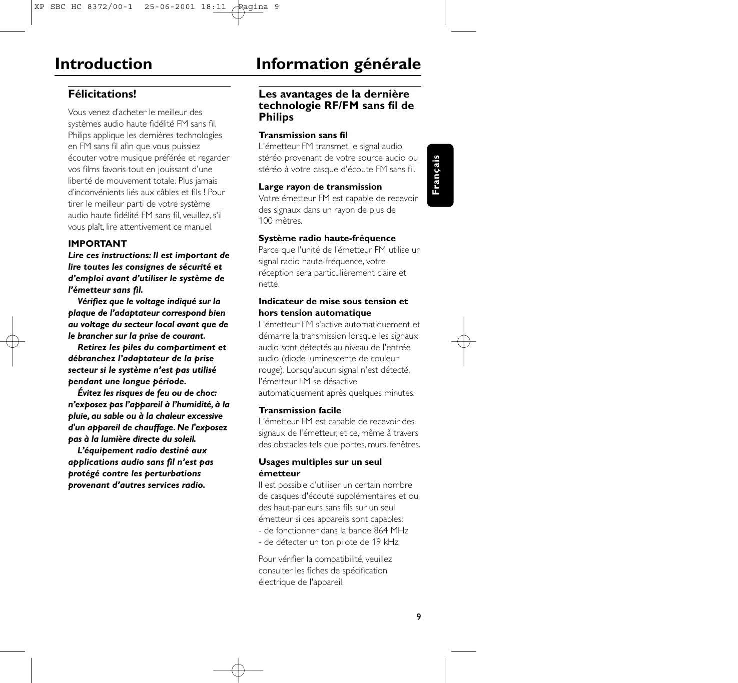 Les avantages de la dernière technologie RF/FM sans fil de Philips Vous venez d’acheter le meilleur des systèmes audio haute fidélité FM sans fil. Philips applique les dernières technologies en FM sans fil afin que vous puissiez écouter votre musique préférée et regarder vos films favoris tout en jouissant d'une liberté de mouvement totale. Plus jamais d’inconvénients liés aux câbles et fils ! Pour tirer le meilleur parti de votre système audio haute fidélité FM sans fil, veuillez, s'il vous plaît, lire attentivement ce manuel. IMPORTANT Lire ces instructions: Il est important de lire toutes les consignes de sécurité et d’emploi avant d’utiliser le système de l’émetteur sans fil. Vérifiez que le voltage indiqué sur la plaque de l’adaptateur correspond bien au voltage du secteur local avant que de le brancher sur la prise de courant. Retirez les piles du compartiment et débranchez l’adaptateur de la prise secteur si le système n’est pas utilisé pendant une longue période. Évitez les risques de feu ou de choc: n’exposez pas l’appareil à l’humidité, à la pluie, au sable ou à la chaleur excessive d'un appareil de chauffage. Ne l'exposez pas à la lumière directe du soleil. L’équipement radio destiné aux applications audio sans fil n’est pas protégé contre les perturbations provenant d’autres services radio. Transmission sans fil L'émetteur FM transmet le signal audio stéréo provenant de votre source audio ou stéréo à votre casque d'écoute FM sans fil. Large rayon de transmission Votre émetteur FM est capable de recevoir des signaux dans un rayon de plus de 100 mètres. Système radio haute-fréquence Parce que l'unité de l’émetteur FM utilise un signal radio haute-fréquence, votre réception sera particulièrement claire et nette. Indicateur de mise sous tension et hors tension automatique L'émetteur FM s'active automatiquement et démarre la transmission lorsque les signaux audio sont détectés au niveau de l'entrée audio (diode luminescente de couleur rouge). Lorsqu'aucun signal n'est détecté, l'émetteur FM se désactive automatiquement après quelques minutes. Transmission facile L'émetteur FM est capable de recevoir des signaux de l'émetteur, et ce, même à travers des obstacles tels que portes, murs, fenêtres. Usages multiples sur un seul émetteur Il est possible d'utiliser un certain nombre de casques d'écoute supplémentaires et ou des haut-parleurs sans fils sur un seul émetteur si ces appareils sont capables: - de fonctionner dans la bande 864 MHz - de détecter un ton pilote de 19 kHz. Pour vérifier la compatibilité, veuillez consulter les fiches de spécification électrique de l'appareil.