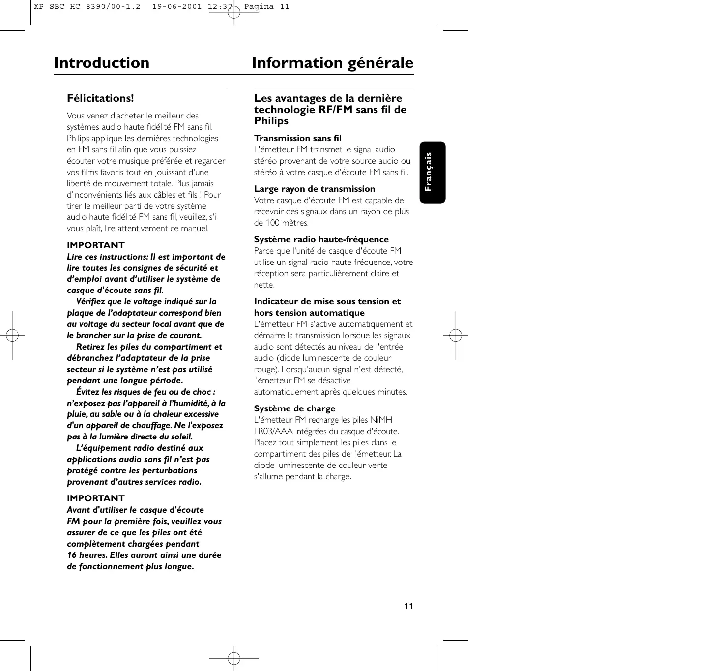 Les avantages de la dernière technologie RF/FM sans fil de Philips Vous venez d’acheter le meilleur des systèmes audio haute fidélité FM sans fil. Philips applique les dernières technologies en FM sans fil afin que vous puissiez écouter votre musique préférée et regarder vos films favoris tout en jouissant d'une liberté de mouvement totale. Plus jamais d’inconvénients liés aux câbles et fils ! Pour tirer le meilleur parti de votre système audio haute fidélité FM sans fil, veuillez, s'il vous plaît, lire attentivement ce manuel. IMPORTANT Lire ces instructions: Il est important de lire toutes les consignes de sécurité et d’emploi avant d’utiliser le système de casque d'écoute sans fil. Vérifiez que le voltage indiqué sur la plaque de l’adaptateur correspond bien au voltage du secteur local avant que de le brancher sur la prise de courant. Retirez les piles du compartiment et débranchez l’adaptateur de la prise secteur si le système n’est pas utilisé pendant une longue période. Évitez les risques de feu ou de choc : n’exposez pas l’appareil à l’humidité, à la pluie, au sable ou à la chaleur excessive d'un appareil de chauffage. Ne l'exposez pas à la lumière directe du soleil. L’équipement radio destiné aux applications audio sans fil n’est pas protégé contre les perturbations provenant d’autres services radio. Transmission sans fil L'émetteur FM transmet le signal audio stéréo provenant de votre source audio ou stéréo à votre casque d'écoute FM sans fil. Large rayon de transmission Votre casque d'écoute FM est capable de recevoir des signaux dans un rayon de plus de 100 mètres. Système radio haute-fréquence Parce que l'unité de casque d'écoute FM utilise un signal radio haute-fréquence, votre réception sera particulièrement claire et nette. Indicateur de mise sous tension et hors tension automatique L'émetteur FM s'active automatiquement et démarre la transmission lorsque les signaux audio sont détectés au niveau de l'entrée audio (diode luminescente de couleur rouge). Lorsqu'aucun signal n'est détecté, l'émetteur FM se désactive automatiquement après quelques minutes. Système de charge L'émetteur FM recharge les piles NiMH LR03/AAA intégrées du casque d'écoute. Placez tout simplement les piles dans le compartiment des piles de l'émetteur. La diode luminescente de couleur verte s'allume pendant la charge. IMPORTANT Avant d'utiliser le casque d'écoute FM pour la première fois, veuillez vous assurer de ce que les piles ont été complètement chargées pendant 16 heures. Elles auront ainsi une durée de fonctionnement plus longue.