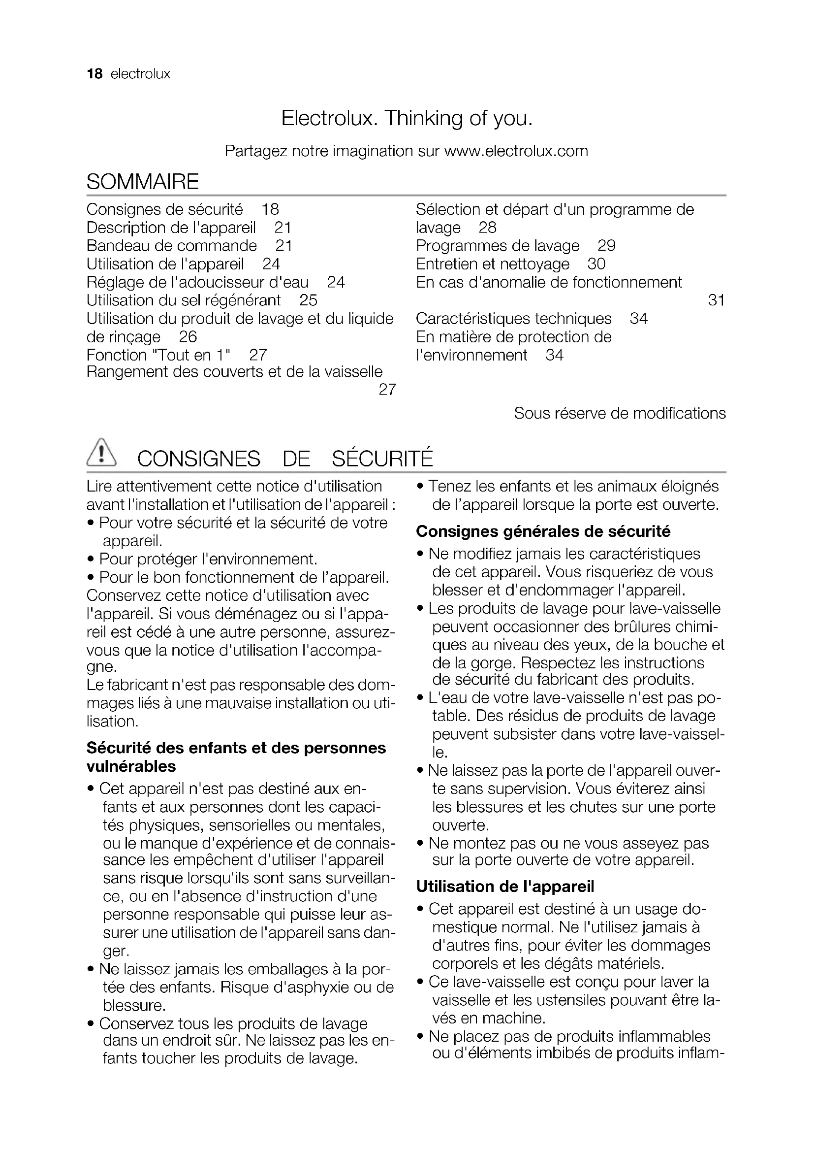 - Pour éviter tout risque corporel ou maté- riel : – Débranchez l'appareil. – Coupez le câble d'alimentation au ras de l'appareil et mettez-le au rebut. – Retirez le loquet de la porte. Ceci évite d'enfermer un enfant ou un animal dans l'appareil par accident. Risque d'asphyxie. – Mettez l'appareil au rebut dans un cen- tre local agréé. 20 electroluxAvertissement Les produits de lavage pour lave-vaisselle sont dangereux et peuvent être corrosifs !