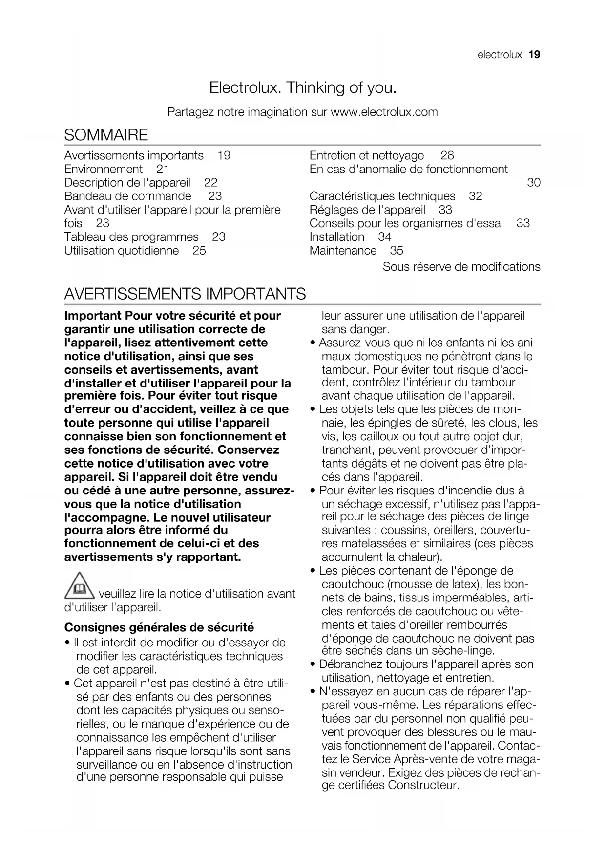 - N'essayez en aucun cas de réparer l'ap- pareil vous-même. Les réparations effec- tuées par du personnel non qualifié peu- vent provoquer des blessures ou le mau- vais fonctionnement de l'appareil. Contac- tez le Service Après-vente de votre maga- sin vendeur. Exigez des pièces de rechan- ge certifiées Constructeur. electrolux 19• Le linge sale, taché d'huile culinaire, d'acé- tone, d'essence, de kérosène, de produit détachant, de térébenthine, de cire ou de décapant pour cire doit être lavé à l'eau chaude avec une plus grande quantité de lessive avant d'être séché dans le sèche- linge.