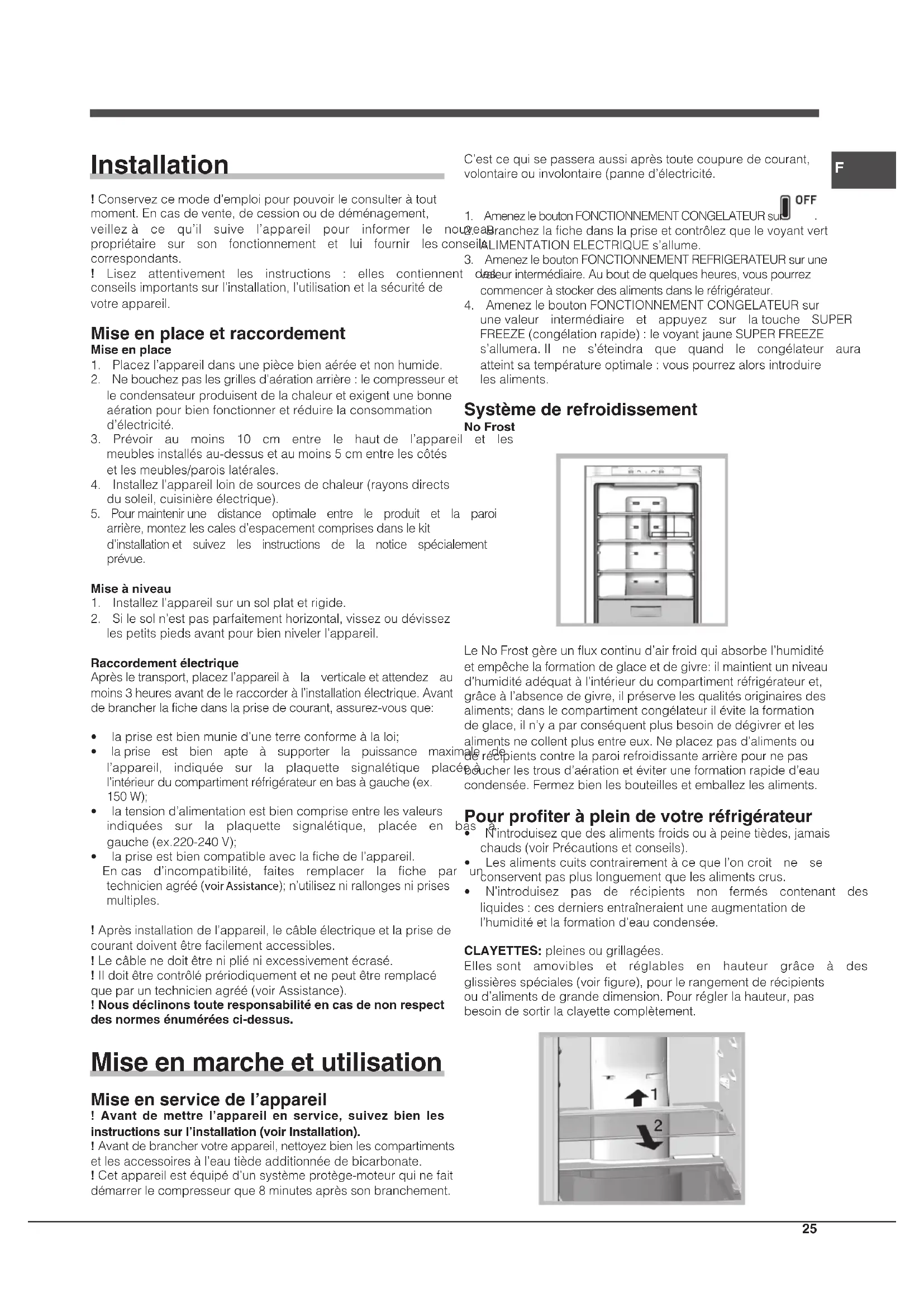 unevaleur intermédiaire et appuyez sur latouche SUPER FREEZE(congélationrapide):levoyantjauneSUPERFREEZE s’allumera.Il ne s’éteindra que quand le congélateur aura atteintsatempératureoptimale:vouspourrezalorsintroduire lesaliments. Système de refroidissement No Frost LeNoFrostgèreunfluxcontinud’airfroidquiabsorbel’humidité etempêchelaformationdeglaceetdegivre:ilmaintientunniveau d’humiditéadéquatàl’intérieurducompartimentréfrigérateuret, grâceàl’absencedegivre,ilpréservelesqualitésoriginairesdes aliments;danslecompartimentcongélateurilévitelaformation deglace,iln’yaparconséquentplusbesoindedégivreretles alimentsnecollentplusentreeux.Neplacezpasd’alimentsou derécipientscontrelaparoirefroidissantearrièrepournepas boucherlestrousd’aérationetéviteruneformationrapided’eau condensée.Fermezbienlesbouteillesetemballezlesaliments. Pour profiter à plein de votre réfrigérateur