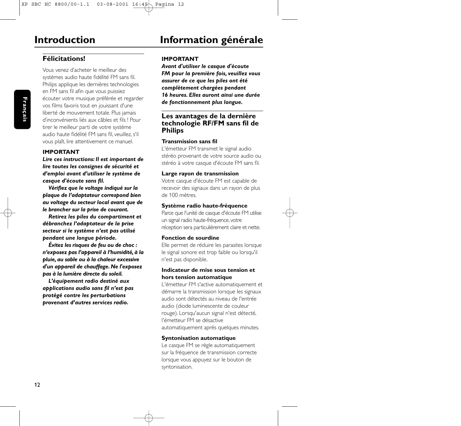IMPORTANT Avant d'utiliser le casque d'écoute FM pour la première fois, veuillez vous assurer de ce que les piles ont été complètement chargées pendant 16 heures. Elles auront ainsi une durée de fonctionnement plus longue. Français Vous venez d’acheter le meilleur des systèmes audio haute fidélité FM sans fil. Philips applique les dernières technologies en FM sans fil afin que vous puissiez écouter votre musique préférée et regarder vos films favoris tout en jouissant d'une liberté de mouvement totale. Plus jamais d’inconvénients liés aux câbles et fils ! Pour tirer le meilleur parti de votre système audio haute fidélité FM sans fil, veuillez, s'il vous plaît, lire attentivement ce manuel. IMPORTANT Lire ces instructions: Il est important de lire toutes les consignes de sécurité et d’emploi avant d’utiliser le système de casque d'écoute sans fil. Vérifiez que le voltage indiqué sur la plaque de l’adaptateur correspond bien au voltage du secteur local avant que de le brancher sur la prise de courant. Retirez les piles du compartiment et débranchez l’adaptateur de la prise secteur si le système n’est pas utilisé pendant une longue période. Évitez les risques de feu ou de choc : n’exposez pas l’appareil à l’humidité, à la pluie, au sable ou à la chaleur excessive d'un appareil de chauffage. Ne l'exposez pas à la lumière directe du soleil. L’équipement radio destiné aux applications audio sans fil n’est pas protégé contre les perturbations provenant d’autres services radio. Les avantages de la dernière technologie RF/FM sans fil de Philips Transmission sans fil L'émetteur FM transmet le signal audio stéréo provenant de votre source audio ou stéréo à votre casque d'écoute FM sans fil. Large rayon de transmission Votre casque d'écoute FM est capable de recevoir des signaux dans un rayon de plus de 100 mètres. Système radio haute-fréquence Parce que l'unité de casque d'écoute FM utilise un signal radio haute-fréquence, votre réception sera particulièrement claire et nette. Fonction de sourdine Elle permet de réduire les parasites lorsque le signal sonore est trop faible ou lorsqu'il n'est pas disponible. Indicateur de mise sous tension et hors tension automatique L'émetteur FM s'active automatiquement et démarre la transmission lorsque les signaux audio sont détectés au niveau de l'entrée audio (diode luminescente de couleur rouge). Lorsqu'aucun signal n'est détecté, l'émetteur FM se désactive automatiquement après quelques minutes. Syntonisation automatique Le casque FM se règle automatiquement sur la fréquence de transmission correcte lorsque vous appuyez sur le bouton de syntonisation.
