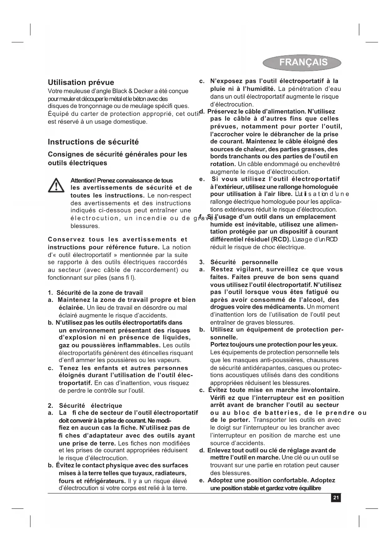 Montage Attention ! Avant l'assemblage, assurez-vous que l'outil est éteint et débranché. Installation et retrait du carter de protection (fi g. A) L’outil est fourni avec un carter de protection réservé à des fi ns de meulage. Si l’unité doit être employée pour des opérations de découpe, un carter de protection spécifi que doit être installé. Un carter de protection pour les opérations de découpe référence 1004484-03 est disponible et peut être obtenu auprès des centres d’entretien Black & Decker. Installation Placez l’outil sur une table, arbre (6) tourné vers le haut. Placez le carter protecteur (5) sur l'outil selon le schéma. Alignez les trous de la plaque de réglage (7) sur les trous de vis (8). Appuyez sur le carter protecteur et insérez les vis (9) dans les trous. Serrez les vis. Retrait Enlevez les vis (9). Retirez la protection de l’outil. Attention! N’utilisez pas l’outil sans carter de protection. Réglage du carter protecteur (fi g. B) Il est possible de faire pivoter le carter de protection sur 180°. Desserrez les vis (9) et l’écrou (10). Faites pivoter le carter de protection à votre convenance. Resserrez les vis et l’écrou. Installation de la poignée latérale Vissez la poignée latérale (3) dans l’un des orifi ces de montage de l’outil. Attention! Utilisez toujours la poignée latérale. Montage et démontage des disques de meulage ou de tronçonnage (fi g. C - F) Utilisez toujours le type de disque adapté à votre application. Utilisez toujours des disques présentant un diamètre et un alésage de dimension correcte (voir caractéristiques techniques). L'épaisseur maximale des disques de meulage est de 6 mm, et de 3,5 mm pour les disques de tronçonnage . Installation Installez le carter de protection comme indiqué ci-dessus. Placez la bride intérieure (11) sur l’arbre (6) comme indiqué (fi g. C). Assurez-vous que la bride est bien en place sur les côtés plats de l’arbre. Placez le disque (12) sur l’arbre (6) comme indiqué (fi g. D). Si le disque comporte un centre surélevé (13), assurezvous qu’il est bien en face de la bride intérieure. Assurez-vous que le disque est bien en place sur la bride intérieure. Placez la bride extérieure (14) sur l’arbre. Lors du montage du disque de meulage, le centre surélevé sur la bride extérieure doit faire face au disque (A dans fi g. E). Lors du montage du27 FRANÇAIS disque de tronçonnage, le centre surélevé sur la bride extérieure doit être opposé au disque (B dans fi g. E). Appuyez sur le verrouillage de l’arbre (4) et ser- rez la bride extérieure à l’aide de la clé à deux griffes (15) (fi g. F). Retrait Appuyez sur le verrouillage de l’arbre (4) et desserrez la bride extérieure (14) à l’aide de la clé à deux griffes (15) (fi g. F). Enlevez la bride extérieure (14) et le disque (12). Utilisation Attention! Laissez l’outil fonctionner à sa propre vitesse. Ne le surchargez pas. Guidez le câble avec soin pour ne pas le couper par mégarde. Attendez-vous à un jet d’étincelles lorsque le disque de meulage ou de tronçonnage touche la pièce à travailler. Placez toujours l’outil de telle sorte que le carter de protection puisse vous protéger au maximum du disque de meulage ou de tronçonnage. Démarrage et arrêt Pour allumer l'outil, appuyez sur le bouton de verrouillage (2) puis sur l'interrupteur de marche/ arrêt (1). Pour éteindre l'outil, relâchez l'interrupteur marche/arrêt (1). Attention! N’éteignez pas l’outil lorsqu’il est encore en charge. Conseils pour une utilisation optimale Tenez l’outil fermement avec une main sur la poignée latérale et l’autre autour de la poignée principale. Lors du meulage, conservez toujours un angle d’environ 15º entre le disque et la surface de la pièce à ouvrer. Entretien Votre appareil/outil Black & Decker avec/sans fi l a été conçu pour fonctionner pendant longtemps avec un minimum d’entretien. Un fonctionnement continu satisfaisant dépend d’un nettoyage régulier et d’un entretien approprié de l’outil. Attention! Avant toute activité d’entretien sur les outils électriques avec/sans fi l: Eteignez et débranchez l’appareil/l’outil. Ou coupez et retirez la batterie de l’appareil/outil s’il comporte un pack-batterie séparé. Voire épuisez complètement la batterie si elle est intégrée puis mettez hors tension. Débranchez le chargeur avant de le nettoyer. Votre chargeur ne nécessite aucun autre entre- tien qu’un nettoyage régulier. Nettoyez régulièrement les fentes de ventilation de votre outil/appareil/chargeur à l’aide d’une brosse douce ou d’un chiffon sec. Nettoyez régulièrement le carter moteur à l’aide d’un chiffon humide. N’utilisez pas de produit abrasif ou à base de solvant. Ouvrez régulièrement le mandrin (le cas échéant) et tapotez dessus pour retirer toute poussière à l’intérieur. Protection de l’environnement Collecte séparée. Ce produit ne doit pas être jeté avec les déchets domestiques normaux. Si vous décidez de remplacer ce produit Black & Decker, ou si vous n’en avez plus l’utilité, ne le jetez pas avec vos déchets domestiques Rendez- le disponible pour une collecte séparée. La collecte séparée des produits et em- ballages usés permet le recyclage des articles afi n de les utiliser à nouveau. Le fait d’utiliser à nouveau des produits recyclés permet d’éviter la pollution environnemen- tale et de réduire la demande de matières premières. Les réglementations locales peuvent permettre la collecte séparée des produits électriques du foyer, dans des déchetteries municipales ou auprès du re- vendeur vous ayant vendu votre nouveau produit. Black & Decker fournit un dispositif permettant de collecter et de recycler les produits Black & Decker lorsqu’ils ont atteint la fi n de leur cycle de vie. Pour pouvoir profi ter de ce service, veuillez retourner votre p