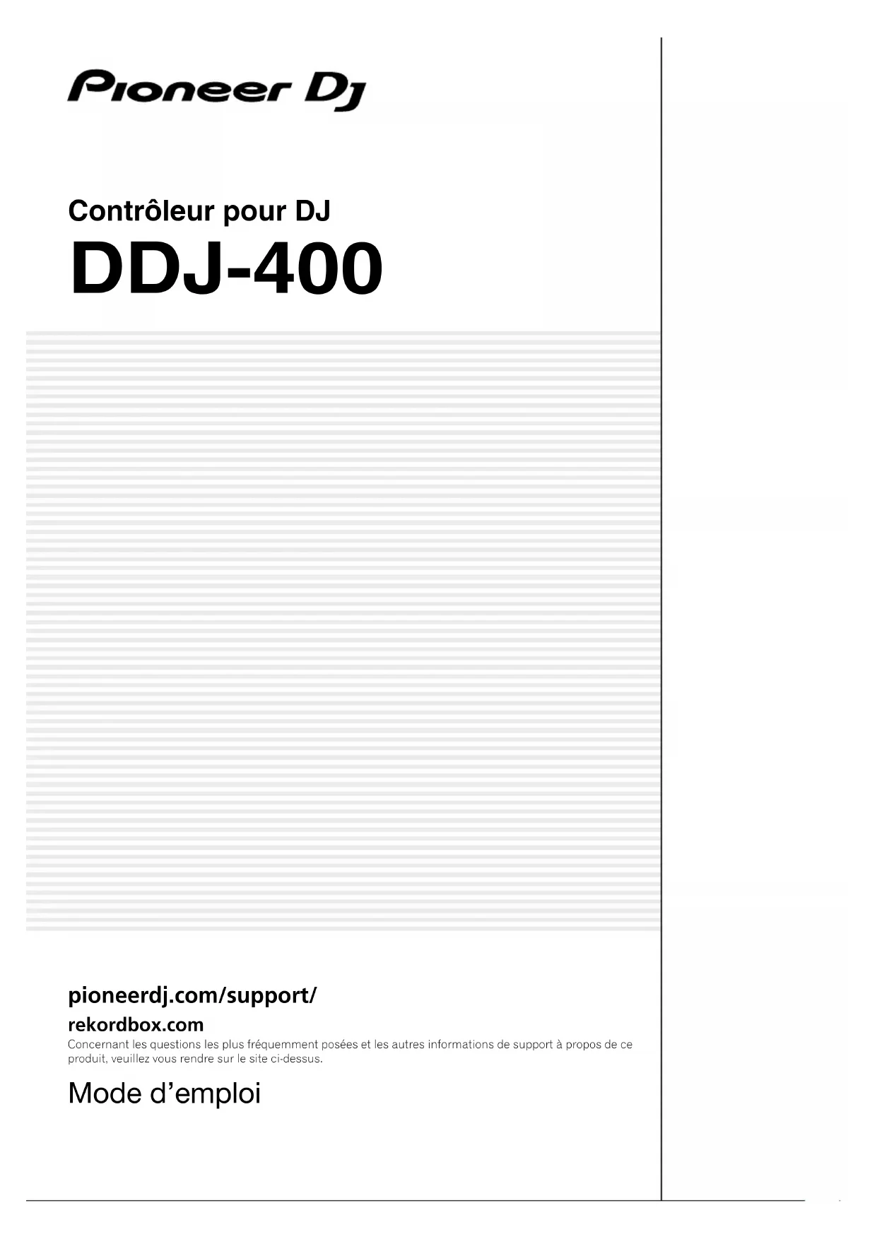 Informations préliminaires Informations préliminaires Contenu du carton d’emballage ! Câble USB! Garantie (pour certaines régions)! Mode d’emploi (Guide de démarrage rapide)! Carte de la clé de licence rekordbox dj Uniquement pour les produits de la région européenne.— Pour la région nord-américaine, les informations correspondantes se trouvent à la dernière page des versions anglaise et française du « Mode d’emploi (Guide de démarrage rapide) ».— Pour le Japon, les informations correspondantes figurent sur la couverture arrière du « Mode d’emploi (Guide de démarrage rapide) ». Remarques Veuillez conserver la clé de licence, car vous n’en n’aurez pas d’autre. Affichage de la «Présentation de rekordbox» La « Présentation de rekordbox » explique la procédure d’installation de rekordbox. 1 Lancez un navigateur Web sur votre PC/Mac pour accéder au site «rekordbox.com». 2 Cliquez sur [Guide] sous [Aide]. 3 Cliquez sur une langue de la «rekordbox introduction». À propos de rekordbox ! rekordbox est un logiciel complet qui gère des morceaux de musique et qui réalise des performances DJ.! « rekordbox dj » est une fonction de performances DJ de rekordbox. Vous pourrez utiliser cette fonction après avoir entré la clé de licence qui figure sur la carte de clé de licence fournie pour « rekordbox dj ». Environnement fonctionnel minimal Systèmes d’exploitation pris en chargeProcesseur et mémoire requiseMac : macOS High Sierra 10.13 / Sierra 10.12 / OS X 10.11 (dernière version)Intel® processor Core™ i7, i5, i34 Go ou plus de RAMWindows : Windows® 10 / Windows® 8.1 / Windows® 7 (dernier service pack)32 bits / 64 bitsIntel® processor Core™ i7, i5, i34 Go ou plus de RAMDiversPort USBUn port USB 2.0 est indispensable pour raccorder votre PC/Mac à cet appareil.Résolution de l’écran Résolution de 1 280 × 768 ou plusConnexion InternetUne connexion Internet est nécessaire pour l’enregistrement du compte utilisateur rekordbox et pour le téléchargement du logiciel.! Le fonctionnement sur tous les PC/Mac n’est pas garanti, même lorsque les conditions de fonctionnement mentionnées ci-dessus sont remplies.! Selon les réglages d’économie d’énergie du PC/Mac, etc., la capacité de traitement du processeur et du disque dur peut être insuffisante. Notamment pour les ordinateurs portables, assurez-vous que le PC/Mac est en état de fournir sa performance optimale (par exemple en laissant le cordon d’alimentation raccordé), surtout si vous utilisez rekordbox.! L’emploi d’Internet exige la signature d’un contrat séparé avec un fournisseur de services Internet et le paiement de droits.! L’aide au Système d’exploitation suppose que vous utilisez les dernières mises à jour pour cette version.! Pour consulter les dernières informations sur l’environnement fonctionnel et la compatibilité, et pour obtenir le dernier système d’exploitation, veuillez vous référer à la section [Configuration Requise] sous [Aide] de « rekordbox.com ». Installation de rekordbox Démarrage de rekordbox Si vous utilisez rekordbox pour la première fois, ou qu’une version supérieure ou inférieure à la version rekordbox 4 est actuellement utilisée, veuillez suivre la procédure suivante pour installer rekordbox.Si une version supérieure à la version rekordbox 5 est déjà installée, veuillez mettre à jour rekordbox pour passer à la dernière version par le biais du Gestionnaire de mises à jour qui s’affiche lorsque vous démarrez rekordbox.! Les préparatifs concernant le PC/Mac, les périphériques réseau et l’environnement Internet nécessaires à la connexion Internet sont du ressort de l’utilisateur.DDJ-400DJ ControllerContrôleur pour DJDJ ControllerDJ ControllerDJ ControllerControlador DJControlador para DJDJ КонтроллерDJコントローラーpioneerdj.com/support/rekordbox.com/For FAQs and other support information for this product, visit the above site.Concernant les questions les plus fréquemment posées et les autres informations de support à propos de ce produit, veuillez vous rendre sur le site ci-dessus.Besuchen Sie für FAQs und andere Support-Informationen die oben aufgeführte Website.Per FAQ e altre informazioni di supporto per questo prodotto, visitare il sito sopra indicato.Voor FAQ's en andere supportinformatie voor dit product, bezoek de bovengenoemde website.Para consultar las preguntas frecuentes y otra información de soporte de este producto, visite el sitio de arriba.Relativamente às FAQ e outras informações de apoio relacionadas com este produto, visite o site em cima.Ответы на часто задаваемые вопросы и другую информацию о поддержке данного устройства см. на приведенном выше веб-сайте. 上記のサイトで、本製品のFAQなどのサポート情報をご覧いただけます。 商品相談・修理受付・付属品購入窓口のご案内 お取り扱いにお困りのとき、本書の巻末をご覧ください。