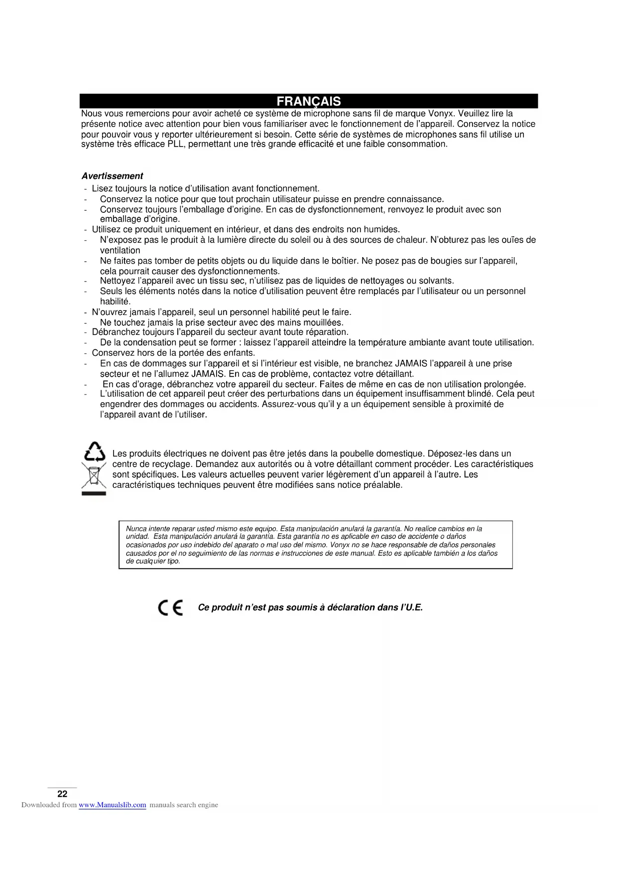 Downloaded from www.Manualslib.com manuals search engine22 FRANÇAIS Nous vous remercions pour avoir acheté ce système de microphone sans fil de marque Vonyx. Veuillez lire la présente notice avec attention pour bien vous familiariser avec le fonctionnement de l’appareil. Conservez la notice pour pouvoir vous y reporter ultérieurement si besoin. Cette série de systèmes de microphones sans fil utilise un système très efficace PLL, permettant une très grande efficacité et une faible consommation. Avertissement - Lisez toujours la notice d’utilisation avant fonctionnement. - Conservez la notice pour que tout prochain utilisateur puisse en prendre connaissance. - Conservez toujours l’emballage d’origine. En cas de dysfonctionnement, renvoyez le produit avec son emballage d’origine. - Utilisez ce produit uniquement en intérieur, et dans des endroits non humides. - N’exposez pas le produit à la lumière directe du soleil ou à des sources de chaleur. N’obturez pas les ouïes de ventilation - Ne faites pas tomber de petits objets ou du liquide dans le boîtier. Ne posez pas de bougies sur l’appareil, cela pourrait causer des dysfonctionnements. - Nettoyez l’appareil avec un tissu sec, n’utilisez pas de liquides de nettoyages ou solvants. - Seuls les éléments notés dans la notice d’utilisation peuvent être remplacés par l’utilisateur ou un personnel habilité. - N’ouvrez jamais l’appareil, seul un personnel habilité peut le faire. - Ne touchez jamais la prise secteur avec des mains mouillées. - Débranchez toujours l’appareil du secteur avant toute réparation. - De la condensation peut se former : laissez l’appareil atteindre la température ambiante avant toute utilisation. - Conservez hors de la portée des enfants. - En cas de dommages sur l’appareil et si l’intérieur est visible, ne branchez JAMAIS l’appareil à une prise secteur et ne l’allumez JAMAIS. En cas de problème, contactez votre détaillant. - En cas d’orage, débranchez votre appareil du secteur. Faites de même en cas de non utilisation prolongée. - L’utilisation de cet appareil peut créer des perturbations dans un équipement insuffisamment blindé. Cela peut engendrer des dommages ou accidents. Assurez-vous qu’il y a un équipement sensible à proximité de l’appareil avant de l’utiliser.