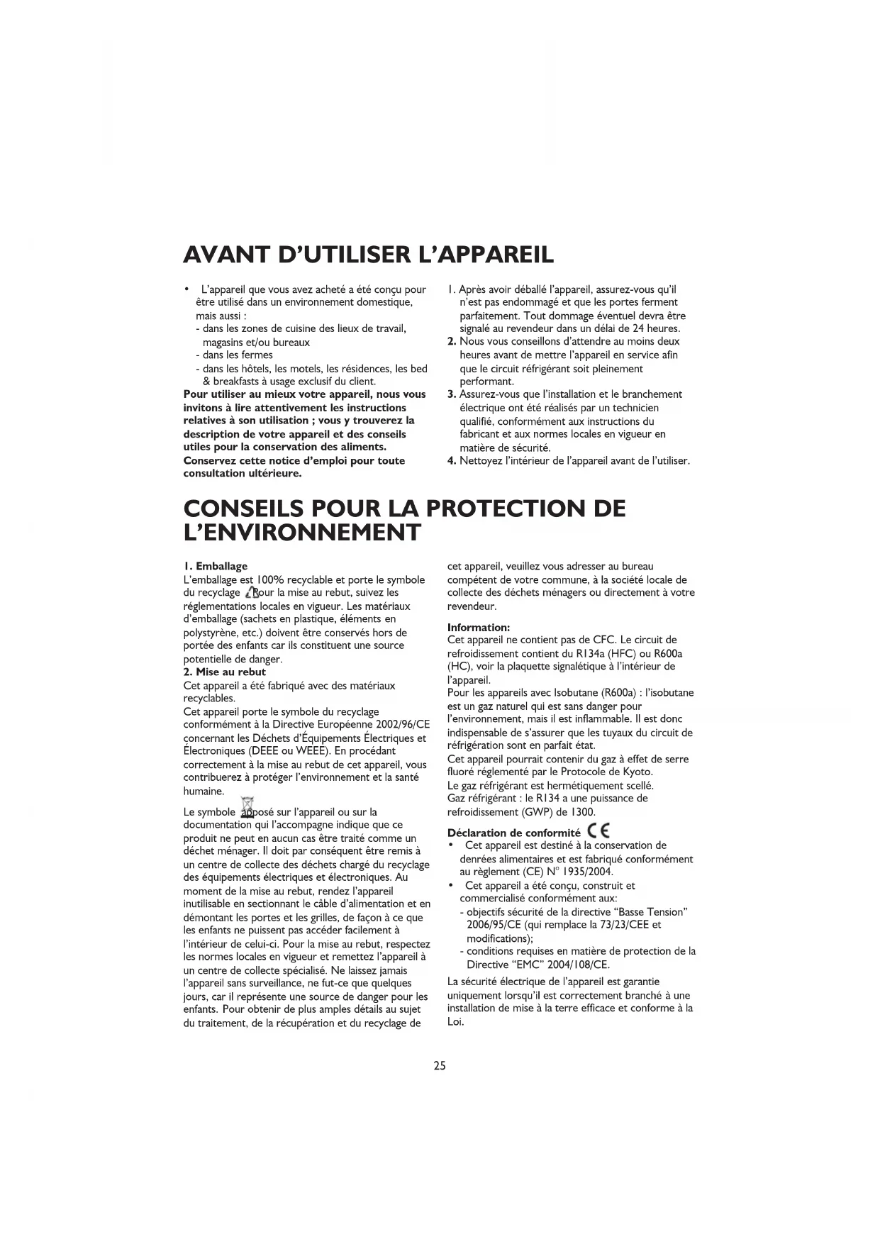 Cet appareil a été fabriqué avec des matériaux recyclables. Cet appareil porte le symbole du recyclage conformément à la Directive Européenne 2002/96/CE concernant les Déchets d’Équipements Électriques et Électroniques (DEEE ou WEEE). En procédant correctement à la mise au rebut de cet appareil, vous contribuerez à protéger l’environnement et la santé humaine. Le symbole apposé sur l’appareil ou sur la documentation qui l’accompagne indique que ce produit ne peut en aucun cas être traité comme un déchet ménager. Il doit par conséquent être remis à un centre de collecte des déchets chargé du recyclage des équipements électriques et électroniques. Au moment de la mise au rebut, rendez l’appareil inutilisable en sectionnant le câble d’alimentation et en démontant les portes et les grilles, de façon à ce que les enfants ne puissent pas accéder facilement à l’intérieur de celui-ci. Pour la mise au rebut, respectez les normes locales en vigueur et remettez l’appareil à un centre de collecte spécialisé. Ne laissez jamais l’appareil sans surveillance, ne fut-ce que quelques jours, car il représente une source de danger pour les enfants. Pour obtenir de plus amples détails au sujet du traitement, de la récupération et du recyclage de cet appareil, veuillez vous adresser au bureau compétent de votre commune, à la société locale de collecte des déchets ménagers ou directement à votre revendeur. Information: Cet appareil ne contient pas de CFC. Le circuit de refroidissement contient du R134a (HFC) ou R600a (HC), voir la plaquette signalétique à l’intérieur de l’appareil. Pour les appareils avec Isobutane (R600a) : l’isobutane est un gaz naturel qui est sans danger pour l’environnement, mais il est inflammable. Il est donc indispensable de s’assurer que les tuyaux du circuit de réfrigération sont en parfait état. Cet appareil pourrait contenir du gaz à effet de serre fluoré réglementé par le Protocole de Kyoto. Le gaz réfrigérant est hermétiquement scellé. Gaz réfrigérant : le R134 a une puissance de refroidissement (GWP) de 1300. Déclaration de conformité t Cet appareil est destiné à la conservation de denrées alimentaires et est fabriqué conformément au règlement (CE) N° 1935/2004. t Cet appareil a été conçu, construit et commercialisé conformément aux: - objectifs sécurité de la directive “Basse Tension” 2006/95/CE (qui remplace la 73/23/CEE et modifications); - conditions requises en matière de protection de la Directive “EMC” 2004/108/CE. La sécurité électrique de l’appareil est garantie uniquement lorsqu’il est correctement branché à une installation de mise à la terre efficace et conforme à la Loi.