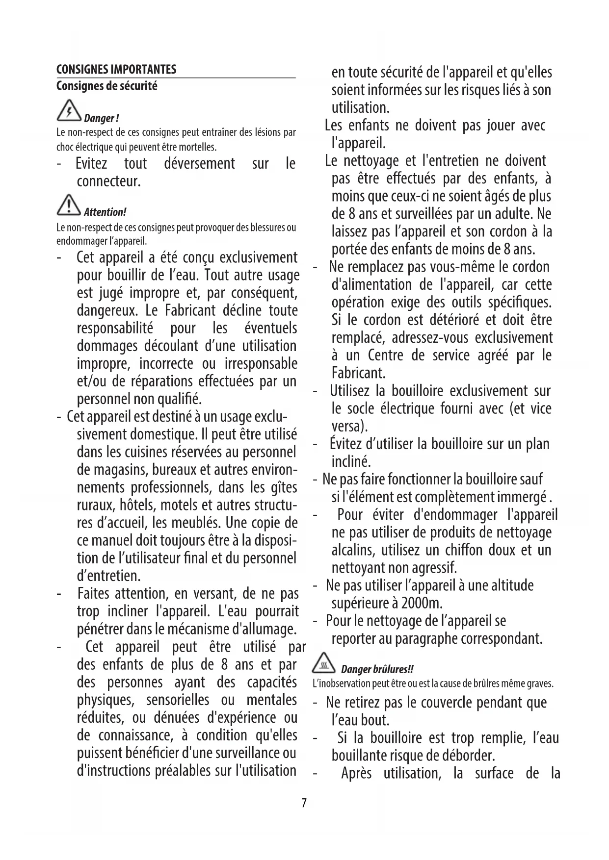 CONSIGNES IMPORTANTES Consignes de sécurité Danger ! Le non-respect de ces consignes peut entraîner des lésions par choc électrique qui peuvent être mortelles. - Evitez tout déversement sur le connecteur. Attention! Le non-respect de ces consignes peut provoquer des blessures ou endommager l’appareil. - Cet appareil a été conçu exclusivement pour bouillir de l’eau. Tout autre usage est jugé impropre et, par conséquent, dangereux. Le Fabricant décline toute responsabilité pour les éventuels dommages découlant d’une utilisation impropre, incorrecte ou irresponsable et/ou de réparations eectuées par un personnel non qualié. - Cet appareil est destiné à un usage exclu- sivement domestique. Il peut être utilisé dans les cuisines réservées au personnel de magasins, bureaux et autres environ- nements professionnels, dans les gîtes ruraux, hôtels, motels et autres structu- res d’accueil, les meublés. Une copie de ce manuel doit toujours être à la disposi- tion de l’utilisateur nal et du personnel d’entretien. - Faites attention, en versant, de ne pas trop incliner l'appareil. L'eau pourrait pénétrer dans le mécanisme d'allumage. - Cet appareil peut être utilisé par des enfants de plus de 8 ans et par des personnes ayant des capacités physiques, sensorielles ou mentales réduites, ou dénuées d'expérience ou de connaissance, à condition qu'elles puissent bénécier d'une surveillance ou d'instructions préalables sur l'utilisation en toute sécurité de l'appareil et qu'elles soient informées sur les risques liés à son utilisation. Les enfants ne doivent pas jouer avec l'appareil. Le nettoyage et l'entretien ne doivent pas être eectués par des enfants, à moins que ceux-ci ne soient âgés de plus de 8 ans et surveillées par un adulte. Ne laissez pas l’appareil et son cordon à la portée des enfants de moins de 8 ans. - Ne remplacez pas vous-même le cordon d'alimentation de l'appareil, car cette opération exige des outils spéciques. Si le cordon est détérioré et doit être remplacé, adressez-vous exclusivement à un Centre de service agréé par le Fabricant. - Utilisez la bouilloire exclusivement sur le socle électrique fourni avec (et vice versa). - Évitez d’utiliser la bouilloire sur un plan incliné. - Ne pas faire fonctionner la bouilloire sauf si l'élément est complètement immergé . - Pour éviter d'endommager l'appareil ne pas utiliser de produits de nettoyage alcalins, utilisez un chion doux et un nettoyant non agressif. - Ne pas utiliser l’appareil à une altitude supérieure à 2000m. - Pour le nettoyage de l’appareil se reporter au paragraphe correspondant. Danger brûlures!! L’inobservation peut être ou est la cause de brûlres même graves. - Ne retirez pas le couvercle pendant que l’eau bout. - Si la bouilloire est trop remplie, l’eau bouillante risque de déborder. - Après utilisation, la surface de la8 résistance est soumise à la chaleur résiduelle. Remarque: Ce pictogramme signale des consignes et informations importantes pour l’utilisateur. - Ne déplacez jamais la bouilloire quand elle est en marche. Danger ! Le non-respect de ces consignes peut entraîner des lésions par choc électrique qui peuvent être mortelles. - Pour prévenir les risques électriques, évitez d’immerger dans l’eau ou dans tout autre liquide les parties électriques, la base où se trouve la prise ou la bouilloire. Évitez de l’utiliser dans la salle de bains ou à proximité d’une source d’eau. Évitez de l’utiliser en plein air. - Débranchez l’appareil si vous ne l’utilisez pas et toujours avant de le nettoyer. Laissez refroidir la bouilloire avant de la nettoyer. - Ne la touchez pas les mains mouillées. - Ne mettre aucun objet dans la bouilloire. L’utilisation d’accessoires non préconisés par le Fabricant peut provoquer un risque d'incendie, de décharges électriques ou de blessures. Attention! Le non-respect de ces consignes peut provoquer des blessures ou endommager l’appareil. - Faites attention, en versant, de ne pas trop incliner l'appareil. L'eau pourrait pénétrer dans le mécanisme d'allumage. - Soyez très vigilant si vous utilisez l’appareil près d’un enfant. - Évitez d’utiliser la bouilloire si les parties électriques ou la che sont abîmées, ni en cas de mauvais fonctionnement ou de panne. Par mesure de sécurité, rapportez l’appareil dans un SAV agréé pour réparation ou remplacement an d'éviter tout danger. Danger brûlures!! L’inobservation peut être ou est la cause de brûlres même graves. - Évitez de toucher les surfaces chaudes, comme le corps ou le couvercle. Utilisez les boutons ou les poignées. - Dans la bouilloire, l’eau reste chaude longtemps après avoir bouilli, ce qui représente un risque de brûlure. Il est recommandé de tenir la bouilloire loin du bord du plan de travail et hors de la portée des enfants. - Veillez à ce que les parties électriques de la bouilloire ne dépassent pas du bord de table ou du plan de travail. - Évitez le contact avec la vapeur qui sort du bec verseur, lorsque vous versez, ou du couvercle et du bec verseur pendant le remplissage. - N’approchez pas la bouilloire, ni son socle, ni ses parties électriques, de surfaces chaudes, plans de cuisson ou fourneaux. Remarque: Ce pictogramme signale des consignes et informations importantes pour l’utilisateur. - Avant de remplir la bouilloire, retirez-la de son socle. - Utilisez la bouilloire exclusivement pour chauer de l’eau. - De’Longhi décline toute responsabilité en cas d’usage impropre de l’appareil ou d’inobservation des instructions. - N’utilisez pas la bouilloire sans couvercle ni ltre. (La bouilloire pourrait ne pas s'éteindre) - Positionnez la bouilloire correctement sur son socle avant de l’allumer. Les matières et les objets destinés au contact avec des produits alimentaires sont conformes au règlement européen (CE) 1935/20