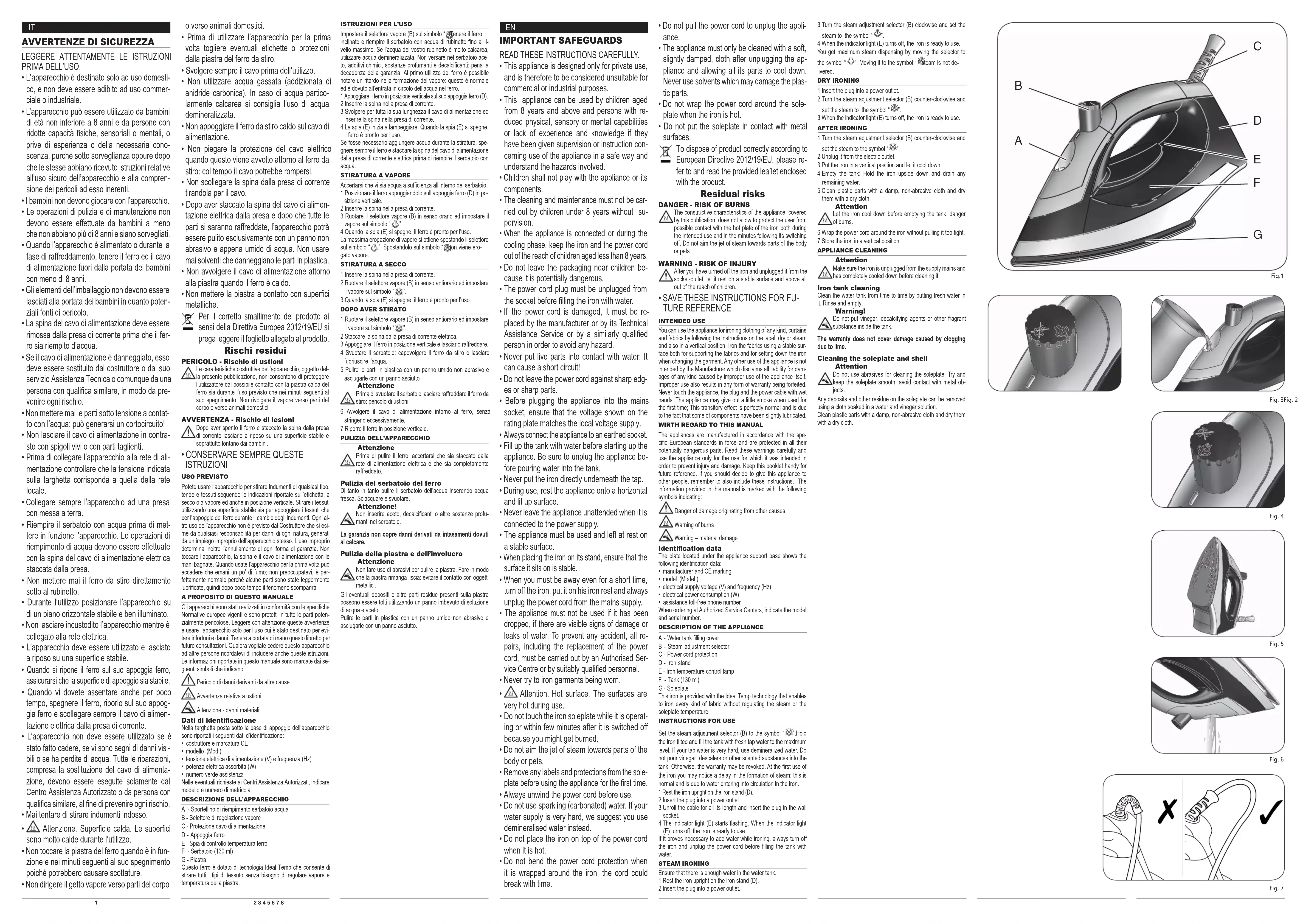 Attention. Surface chaude. Les surfaces sont très chaudes pendant l’utilisation. Ne pas toucher la semelle du fer lorsqu’il marche ou quelques minutes après l’avoir éteint car on pourrait se brûler. Ne pas diriger le Met vapeur vers des parties du corps ou vers les animaux domestiques. Avant d’utiliser l’appareil la première fois, retirez les protections et les étiquettes éventuelles sur la semelle chauffante du fer à repasser. Déroulez touMours le ckble avant utilisation. N’utilisez Mamais d’eau gazeuse (additionnée d’anh\dride de carbone). Au cas où l’eau serait particulièrement calcaire il est conseillé d’utili- ser de l’eau déminéralisée. Ne pas mettre le fer à repasser chaud, en appui sur le cordon d’alimentation. Ne pas plier la protection du ckble électrique au moment où on l’enroule autour du fer à repas- ser avec le temps, le cordon pourrait se casser. Ne pas débrancher la ¿che de la prise de cou- rant en tirant sur le cordon. Une fois que l’appareil aura été débranché et que toutes les parties auront refroidi, il sera possible de le netto\er exclusivement avec un chiffon non abrasif et à peine humide. N’utilisez Mamais de solvants car ils altèrent les parties en plastique. Ne pas enrouler le cordon d’alimentation autour de la semelle lorsque le fer est encore chaud. Ne pas mettre la semelle en contact avec les surfaces métalliques. Pour l’élimination correcte du produit aux termes de la Directive Européenne 2012/19/ EU, nous vous prions de lire le feuillet qui accompagne le produit. Risques résiduels