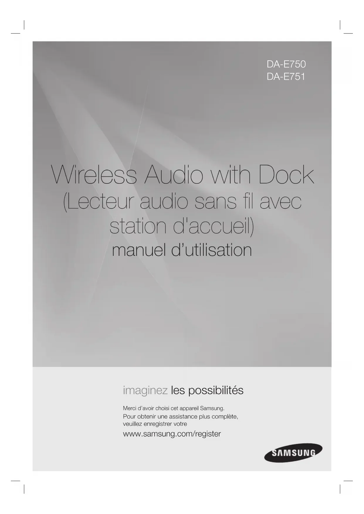 678) www.samsung.com SWEDEN 0771 726 7864 (SAMSUNG) www.samsung.com Switzerland 0848 - SAMSUNG(7267864, CHF 0.08/min) www.samsung.com/ch www.samsung.com/ch_ fr (French) U.K 0330 SAMSUNG (7267864) www.samsung.com EIRE 0818 717100 www.samsung.com LITHUANIA 8-800-77777 www.samsung.com LATVIA 8000-7267 www.samsung.com ESTONIA 800-7267 www.samsung.com Contact SAMSUNG WORLD WIDE If you have any questions or comments relating to Samsung products, please contact the SAMSUNG customer care centre.Wireless Audio with Dock (Lecteur audio sans fil avec station d'accueil) manuel d’utilisation imaginez les possibilités Merci d’avoir choisi cet appareil Samsung.Pour obtenir une assistance plus complète, veuillez enregistrer votrewww.samsung.com/register DA-E750 DA-E7512 caractéristiques Lecture AllShare Cette fonction permet d’écouter la musique enregistrée sur vos appareils (ex. : ordinateur, Smartphone ou serveur NAS) à l'aide du lecteur audio sans fil avec station d’accueil via une connexion réseau. AirPlay La technologie Airplay permet d’écouter la musique stockée sur vos appareils Apple à l’aide du lecteur audio sans fil avec station d’accueil. Enceintes de la station d’accueil Dual Docking Audio La station d’accueil dual docking pour appareils Samsung Galaxy ou Apple permet le chargement et la lecture de fichiers stockés sur ces appareils via ses enceintes intégrées. Prise en charge de la fonction USB Host Vous pouvez connecter des périphériques de stockage USB externes (lecteur MP3, mémoire flash USB, etc.) afin d’en lire les fichiers musicaux à l’aide de la fonction USB HOST du lecteur audio sans fil avec station d’accueil. Fonction Bluetooth Vous pouvez connecter un périphérique Bluetooth au lecteur audio sans fil avec station d’accueil pour écouter de la musique stockée sur le périphérique avec un son stéréo de grande qualité, le tout sans fil ! aptX