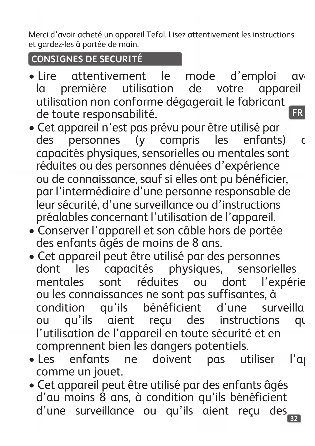Merci d'avoir acheté un appareil Tefal. Lisez attentivement les instructions et gardez-les à portée de main.