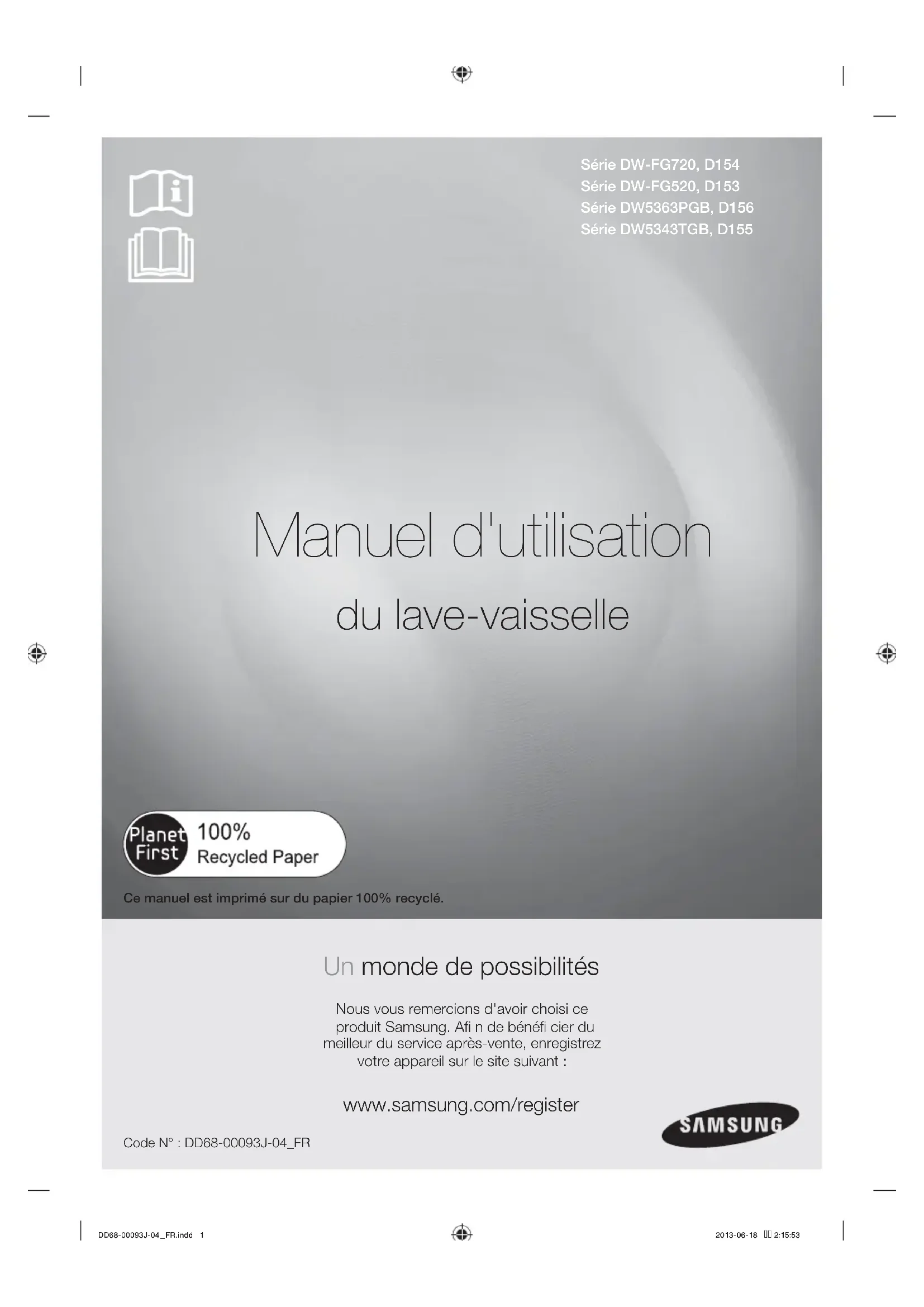 www.samsung.com/Levant(English) Code No.: DD68-00093J-04_EN DD68-00093J-04_EN.indd 38DD68-00093J-04_EN.indd 38 2013-06-18 2:15:162013-06-18 2:15:16Série DW-FG720, D154 Série DW-FG520, D153 Série DW5363PGB, D156 Série DW5343TGB, D155 Manuel d'utilisation du lave-vaisselle Ce manuel est imprimé sur du papier 100% recyclé. Un monde de possibilités Nous vous remercions d'avoir choisi ce produit Samsung. Afi n de bénéfi cier du meilleur du service après-vente, enregistrez votre appareil sur le site suivant: www.samsung.com/register Code N°: DD68-00093J-04_FR DD68-00093J-04_FR.indd 1DD68-00093J-04_FR.indd 1 2013-06-18 2:15:532013-06-18 2:15:532_ Fonctions de votre nouveau lave-vaisselle Samsung Fonctions de votre nouveau lave-vaisselle Samsung Votre nouveau lave-vaisselle va changer votre manière de faire la vaisselle. Entre ses fonctions spécialisées et son e cacité énergétique, votre nouveau lave- vaisselle Samsung vous procure un lavage de vos ustensiles de cuisine aussi facile qu'agréable.