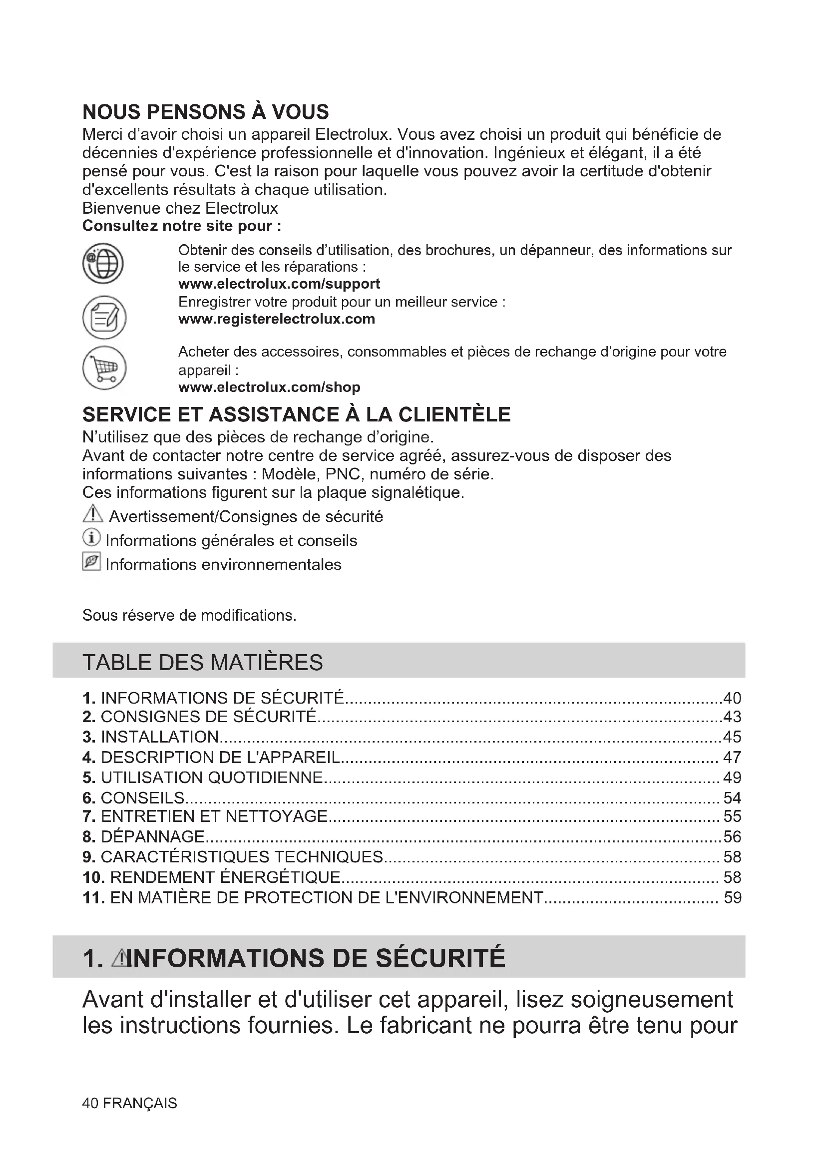 Merci d’avoir choisi un appareil Electrolux. Vous avez choisi un produit qui bénéficie de décennies d'expérience professionnelle et d'innovation. Ingénieux et élégant, il a été pensé pour vous. C'est la raison pour laquelle vous pouvez avoir la certitude d'obtenir d'excellents résultats à chaque utilisation. Bienvenue chez Electrolux Consultez notre site pour :Obtenir des conseils d’utilisation, des brochures, un dépanneur, des informations surle service et les réparations :www.electrolux.com/supportEnregistrer votre produit pour un meilleur service :www.registerelectrolux.comAcheter des accessoires, consommables et pièces de rechange d’origine pour votreappareil :www.electrolux.com/shop