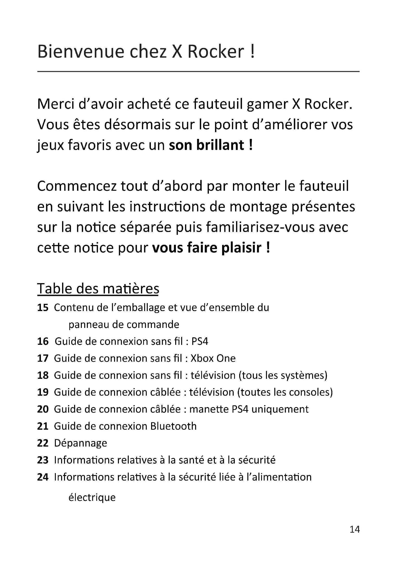 Guide de connexion sans l : PS4 17 Guide de connexion sans l : Xbox One 18 Guide de connexion sans l : télévision (tous les systèmes) 19 Guide de connexion câblée : télévision (toutes les consoles) 20 Guide de connexion câblée : manee PS4 uniquement 21 Guide de connexion Bluetooth 22 Dépannage 23 Informaons relaves à la santé et à la sécurité 24 Informaons relaves à la sécurité liée à l’alimentaon électrique Bienvenue chez X Rocker !15