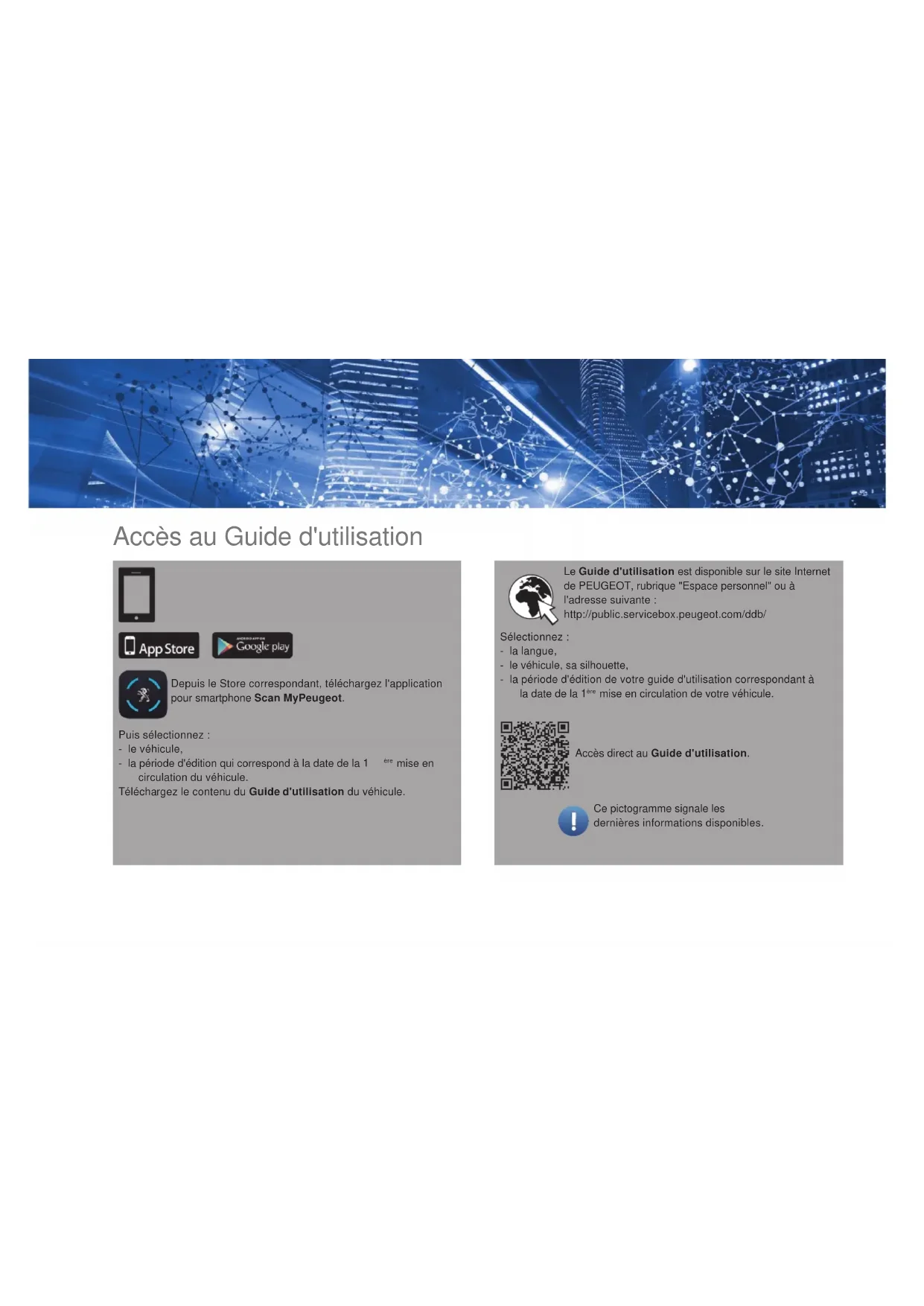 PEUGEOT 5008 GUIDE D'UTILISATIONAccès au Guide d'utilisation Depuis le Store correspondant, téléchargez l'application pour smartphone Scan MyPeugeot. Accès direct au Guide d'utilisation. Le Guide d'utilisation est disponible sur le site Internet de PEUGEOT, rubrique "Espace personnel" ou à l'adresse suivante : http://public.servicebox.peugeot.com/ddb/ Puis sélectionnez : - le véhicule, - la période d'édition qui correspond à la date de la 1 ère mise en circulation du véhicule. Téléchargez le contenu du Guide d'utilisation du véhicule. Sélectionnez : - la langue, - le véhicule, sa silhouette, - la période d'édition de votre guide d'utilisation correspondant à la date de la 1 ère mise en circulation de votre véhicule. Ce pictogramme signale les dernières informations disponibles.Bienvenue Nous vous remercions d'avoir choisi une Peugeot 5008. Ce document présente les informations et recommandations indispensables à la découverte de votre véhicule, en toute sécurité. Votre véhicule reprend une partie des équipements décrits dans ce document, en fonction du niveau de finition, de la version et des caractéristiques propres au pays de commercialisation. Les descriptions et figures sont données sans engagement. Automobiles PEUGEOT se réserve le droit de modifier les caractéristiques techniques, équipements et accessoires sans être tenue de mettre à jour le présent guide. En cas de cession de votre véhicule, pensez à remettre ce Guide d'utilisation au nouveau propriétaire. Dans ce document, retrouvez l'ensemble des instructions et recommandations de fonctionnement qui permettront de profiter au mieux de votre véhicule. Il est fortement recommandé d'en prendre connaissance ainsi que du carnet d/entretien et de garanties qui vous renseignera sur les garanties, l'entretien et l'assistance routière associés à votre véhicule. Légende Avertissement pour la sécurité Information complémentaire Contribution à la protection de la nature Véhicule avec conduite à gauche Véhicule avec conduite à droite2