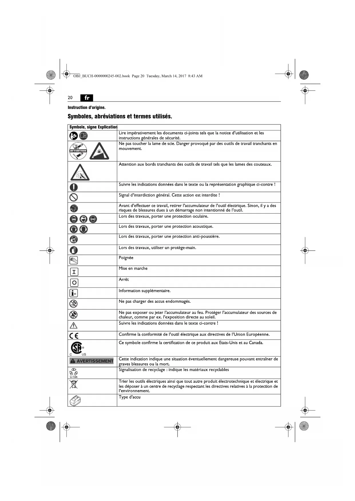 Instruction d’origine. Symboles, abréviations et termes utilisés. Symbole, signe Explication Lire impérativement les documents ci-joints tels que la notice d’utilisation et les instructions générales de sécurité. Ne pas toucher la lame de scie. Danger provoqué par des outils de travail tranchants en mouvement. Attention aux bords tranchants des outils de travail tels que les lames des couteaux. Suivre les indications données dans le texte ou la représentation graphique ci-contre ! Signal d’interdiction général. Cette action est interdite ! Avant d’effectuer ce travail, retirer l’accumulateur de l’outil électrique. Sinon, il y a des risques de blessures dues à un démarrage non intentionné de l’outil. Lors des travaux, porter une protection oculaire. Lors des travaux, porter une protection acoustique. Lors des travaux, porter une protection anti-poussière. Lors des travaux, utiliser un protège-main. Poignée Mise en marche Arrêt Information supplémentaire. Ne pas charger des accus endommagés. Ne pas exposer ou jeter l’accumulateur au feu. Protéger l’accumulateur des sources de chaleur, comme par ex. l’exposition directe au soleil. Suivre les indications données dans le texte ci-contre ! Confirme la conformité de l’outil électrique aux directives de l’Union Européenne. Ce symbole confirme la certification de ce produit aux Etats-Unis et au Canada. Cette indication indique une situation éventuellement dangereuse pouvant entraîner de graves blessures ou la mort. Signalisation de recyclage : indique les matériaux recyclables Trier les outils électriques ainsi que tout autre produit électrotechnique et électrique et les déposer à un centre de recyclage respectant les directives relatives à la protection de l’environnement. Type d’accu AVERTISSEMENT OBJ_BUCH-0000000245-002.book Page 20 Tuesday, March 14, 2017 8:43 AM21