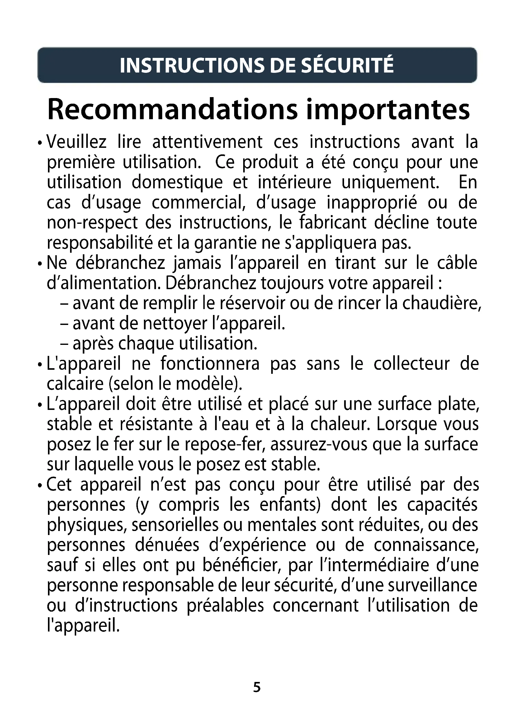 - Veuillez lire attentivement ces instructions avant la première utilisation. Ce produit a été conçu pour une utilisation domestique et intérieure uniquement. En cas d’usage commercial, d’usage inapproprié ou de non-respect des instructions, le fabricant décline toute responsabilité et la garantie ne s'appliquera pas.