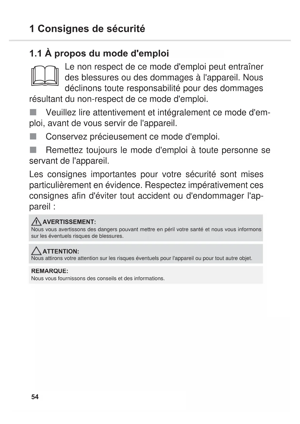 Nous vous avertissons des dangers pouvant mettre en péril votre santé et nous vous informonssur les éventuels risques de blessures. ATTENTION: Nous attirons votre attention sur les risques éventuels pour l'appareil ou pour tout autre objet. REMARQUE: Nous vous fournissons des conseils et des informations.
