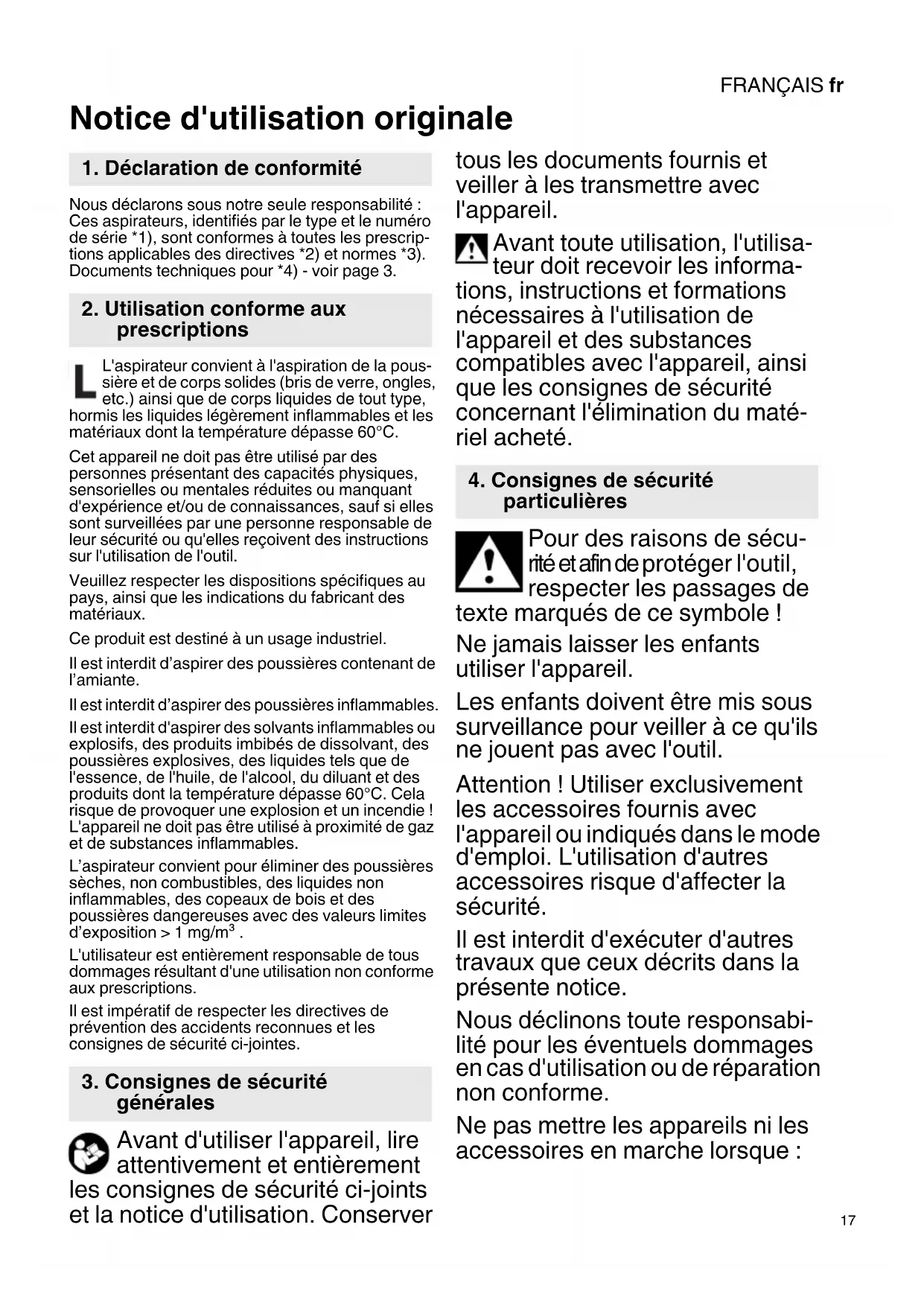 Notice d'utilisation originale Nous déclarons sous notre seule responsabilité : Ces aspirateurs, identifiés par le type et le numéro de série *1), sont conformes à toutes les prescrip- tions applicables des directives *2) et normes *3). Documents techniques pour *4) - voir page 3. L'aspirateur convient à l'aspiration de la pous- sière et de corps solides (bris de verre, ongles, etc.) ainsi que de corps liquides de tout type, hormis les liquides légèrement inflammables et les matériaux dont la température dépasse 60°C. Cet appareil ne doit pas être utilisé par des personnes présentant des capacités physiques, sensorielles ou mentales réduites ou manquant d'expérience et/ou de connaissances, sauf si elles sont surveillées par une personne responsable de leur sécurité ou qu'elles reçoivent des instructions sur l'utilisation de l'outil. Veuillez respecter les dispositions spécifiques au pays, ainsi que les indications du fabricant des matériaux. Ce produit est destiné à un usage industriel. Il est interdit d’aspirer des poussières contenant de l’amiante. Il est interdit d’aspirer des poussières inflammables. Il est interdit d'aspirer des solvants inflammables ou explosifs, des produits imbibés de dissolvant, des poussières explosives, des liquides tels que de l'essence, de l'huile, de l'alcool, du diluant et des produits dont la température dépasse 60°C. Cela risque de provoquer une explosion et un incendie ! L'appareil ne doit pas être utilisé à proximité de gaz et de substances inflammables. L’aspirateur convient pour éliminer des poussières sèches, non combustibles, des liquides non inflammables, des copeaux de bois et des poussières dangereuses avec des valeurs limites d’exposition > 1 mg/m³ . L'utilisateur est entièrement responsable de tous dommages résultant d'une utilisation non conforme aux prescriptions. Il est impératif de respecter les directives de prévention des accidents reconnues et les consignes de sécurité ci-jointes. Avant d'utiliser l'appareil, lire attentivement et entièrement les consignes de sécurité ci-joints et la notice d'utilisation. Conserver tous les documents fournis et veiller à les transmettre avec l'appareil. Avant toute utilisation, l'utilisa- teur doit recevoir les informa- tions, instructions et formations nécessaires à l'utilisation de l'appareil et des substances compatibles avec l'appareil, ainsi que les consignes de sécurité concernant l'élimination du maté- riel acheté. Pour des raisons de sécu- rité et afin de protéger l'outil, respecter les passages de texte marqués de ce symbole ! Ne jamais laisser les enfants utiliser l'appareil. Les enfants doivent être mis sous surveillance pour veiller à ce qu'ils ne jouent pas avec l'outil. Attention ! Utiliser exclusivement les accessoires fournis avec l'appareil ou indiqués dans le mode d'emploi. L'utilisation d'autres accessoires risque d'affecter la sécurité. Il est interdit d'exécuter d'autres travaux que ceux décrits dans la présente notice. Nous déclinons toute responsabi- lité pour les éventuels dommages en cas d'utilisation ou de réparation non conforme. Ne pas mettre les appareils ni les accessoires en marche lorsque :