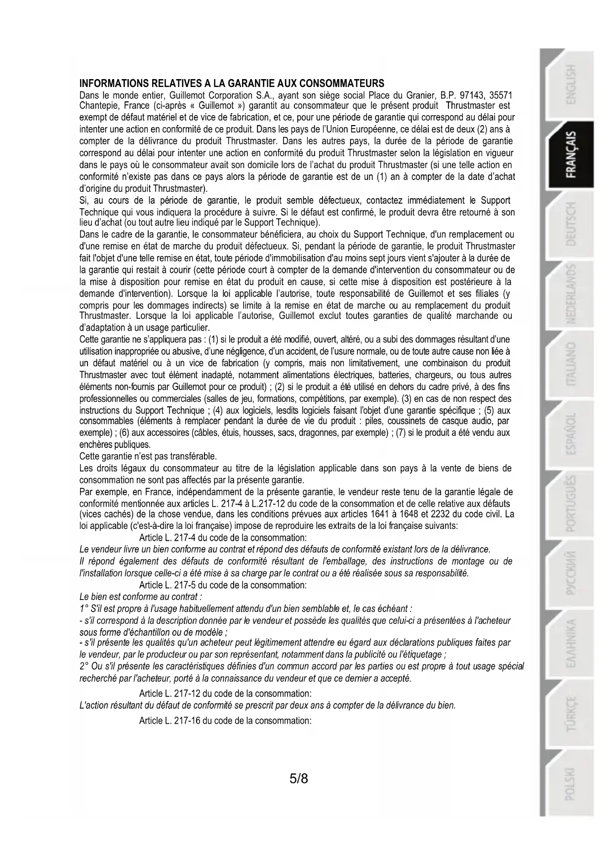 INFORMATIONS RELATIVES A LA GARANTIE AUX CONSOMMATEURS Dans le monde entier, Guillemot Corporation S.A., ayant son siège social Place du Granier, B.P. 97143, 35571 Chantepie, France (ci-après « Guillemot ») garantit au consommateur que le présent produit Thrustmaster est exempt de défaut matériel et de vice de fabrication, et ce, pour une période de garantie qui correspond au délai pour intenter une action en conformité de ce produit. Dans les pays de l’Union Européenne, ce délai est de deux (2) ans à compter de la délivrance du produit Thrustmaster. Dans les autres pays, la durée de la période de garantie correspond au délai pour intenter une action en conformité du produit Thrustmaster selon la législation en vigueur dans le pays où le consommateur avait son domicile lors de l’achat du produit Thrustmaster (si une telle action en conformité n’existe pas dans ce pays alors la période de garantie est de un (1) an à compter de la date d’achat d’origine du produit Thrustmaster). Si, au cours de la période de garantie, le produit semble défectueux, contactez immédiatement le Support Technique qui vous indiquera la procédure à suivre. Si le défaut est confirmé, le produit devra être retourné à son lieu d’achat (ou tout autre lieu indiqué par le Support Technique). Dans le cadre de la garantie, le consommateur bénéficiera, au choix du Support Technique, d'un remplacement ou d'une remise en état de marche du produit défectueux. Si, pendant la période de garantie, le produit Thrustmaster fait l'objet d'une telle remise en état, toute période d'immobilisation d'au moins sept jours vient s'ajouter à la durée de la garantie qui restait à courir (cette période court à compter de la demande d'intervention du consommateur ou de la mise à disposition pour remise en état du produit en cause, si cette mise à disposition est postérieure à la demande d'intervention). Lorsque la loi applicable l’autorise, toute responsabilité de Guillemot et ses filiales (y compris pour les dommages indirects) se limite à la remise en état de marche ou au remplacement du produit Thrustmaster. Lorsque la loi applicable l’autorise, Guillemot exclut toutes garanties de qualité marchande ou d’adaptation à un usage particulier. Cette garantie ne s’appliquera pas : (1) si le produit a été modifié, ouvert, altéré, ou a subi des dommages résultant d’une utilisation inappropriée ou abusive, d’une négligence, d’un accident, de l’usure normale, ou de toute autre cause non liée à un défaut matériel ou à un vice de fabrication (y compris, mais non limitativement, une combinaison du produit Thrustmaster avec tout élément inadapté, notamment alimentations électriques, batteries, chargeurs, ou tous autres éléments non-fournis par Guillemot pour ce produit) ; (2) si le produit a été utilisé en dehors du cadre privé, à des fins professionnelles ou commerciales (salles de jeu, formations, compétitions, par exemple). (3) en cas de non respect des instructions du Support Technique ; (4) aux logiciels, lesdits logiciels faisant l’objet d’une garantie spécifique ; (5) aux consommables (éléments à remplacer pendant la durée de vie du produit : piles, coussinets de casque audio, par exemple) ; (6) aux accessoires (câbles, étuis, housses, sacs, dragonnes, par exemple) ; (7) si le produit a été vendu aux enchères publiques. Cette garantie n’est pas transférable. Les droits légaux du consommateur au titre de la législation applicable dans son pays à la vente de biens de consommation ne sont pas affectés par la présente garantie. Par exemple, en France, indépendamment de la présente garantie, le vendeur reste tenu de la garantie légale de conformité mentionnée aux articles L. 217-4 à L.217-12 du code de la consommation et de celle relative aux défauts (vices cachés) de la chose vendue, dans les conditions prévues aux articles 1641 à 1648 et 2232 du code civil. La loi applicable (c'est-à-dire la loi française) impose de reproduire les extraits de la loi française suivants: Article L. 217-4 du code de la consommation: Le vendeur livre un bien conforme au contrat et répond des défauts de conformité existant lors de la délivrance. Il répond également des défauts de conformité résultant de l'emballage, des instructions de montage ou de l'installation lorsque celle-ci a été mise à sa charge par le contrat ou a été réalisée sous sa responsabilité. Article L. 217-5 du code de la consommation: Le bien est conforme au contrat : 1° S'il est propre à l'usage habituellement attendu d'un bien semblable et, le cas échéant : - s'il correspond à la description donnée par le vendeur et possède les qualités que celui-ci a présentées à l'acheteur sous forme d'échantillon ou de modèle ; - s'il présente les qualités qu'un acheteur peut légitimement attendre eu égard aux déclarations publiques faites par le vendeur, par le producteur ou par son représentant, notamment dans la publicité ou l'étiquetage ; 2° Ou s'il présente les caractéristiques définies d'un commun accord par les parties ou est propre à tout usage spécial recherché par l'acheteur, porté à la connaissance du vendeur et que ce dernier a accepté. Article L. 217-12 du code de la consommation: L'action résultant du défaut de conformité se prescrit par deux ans à compter de la délivrance du bien. Article L. 217-16 du code de la consommation:6/8 Lorsque l'acheteur demande au vendeur, pendant le cours de la garantie commerciale qui lui a été consentie lors de l'acquisition ou de la réparation d'un bien meuble, une remise en état couverte par la garantie, toute période d'immobilisation d'au moins sept jours vient s'ajouter à la durée de la garantie qui restait à courir. Cette période court à compter de la demande d'intervention de l'acheteur ou de la mise à disposition pour réparation du bien en cause, si cette 